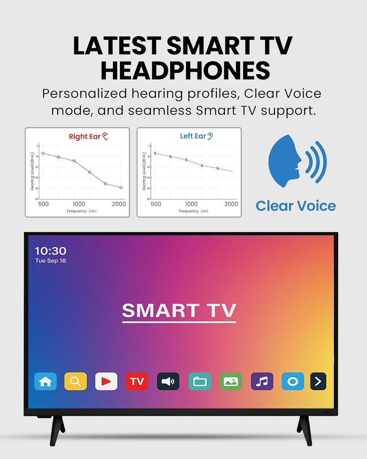 【Voice Clarity & Advanced EQ】Activate Voice Clear Mode to sharpen dialogue for seniors and the hard of hearing, and fine-tune audio further with the in-app EQ for deeper personalized control.