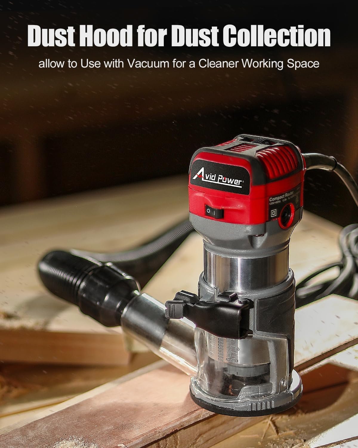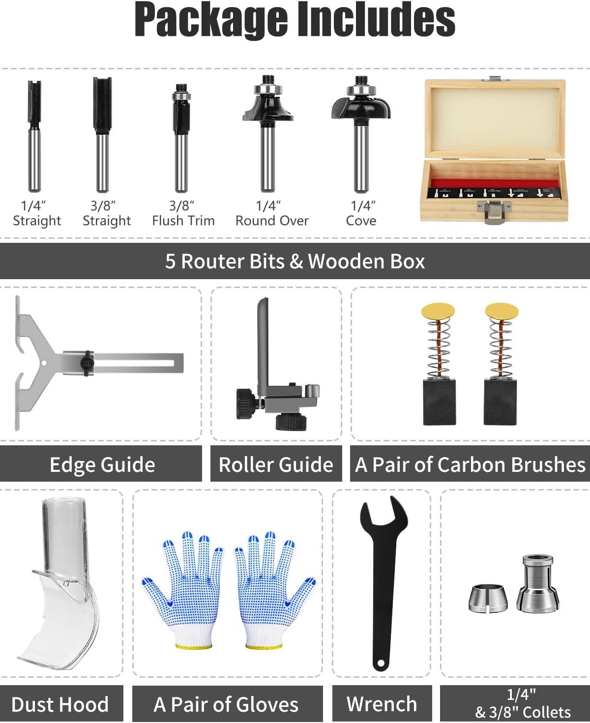 Package Included – 1.25 HP compact router tool with 12.1Ft/3.7m cord, 5 router bits, edge guide, roller guide, dust hood, 3/8” and 1/4” collet, wrench