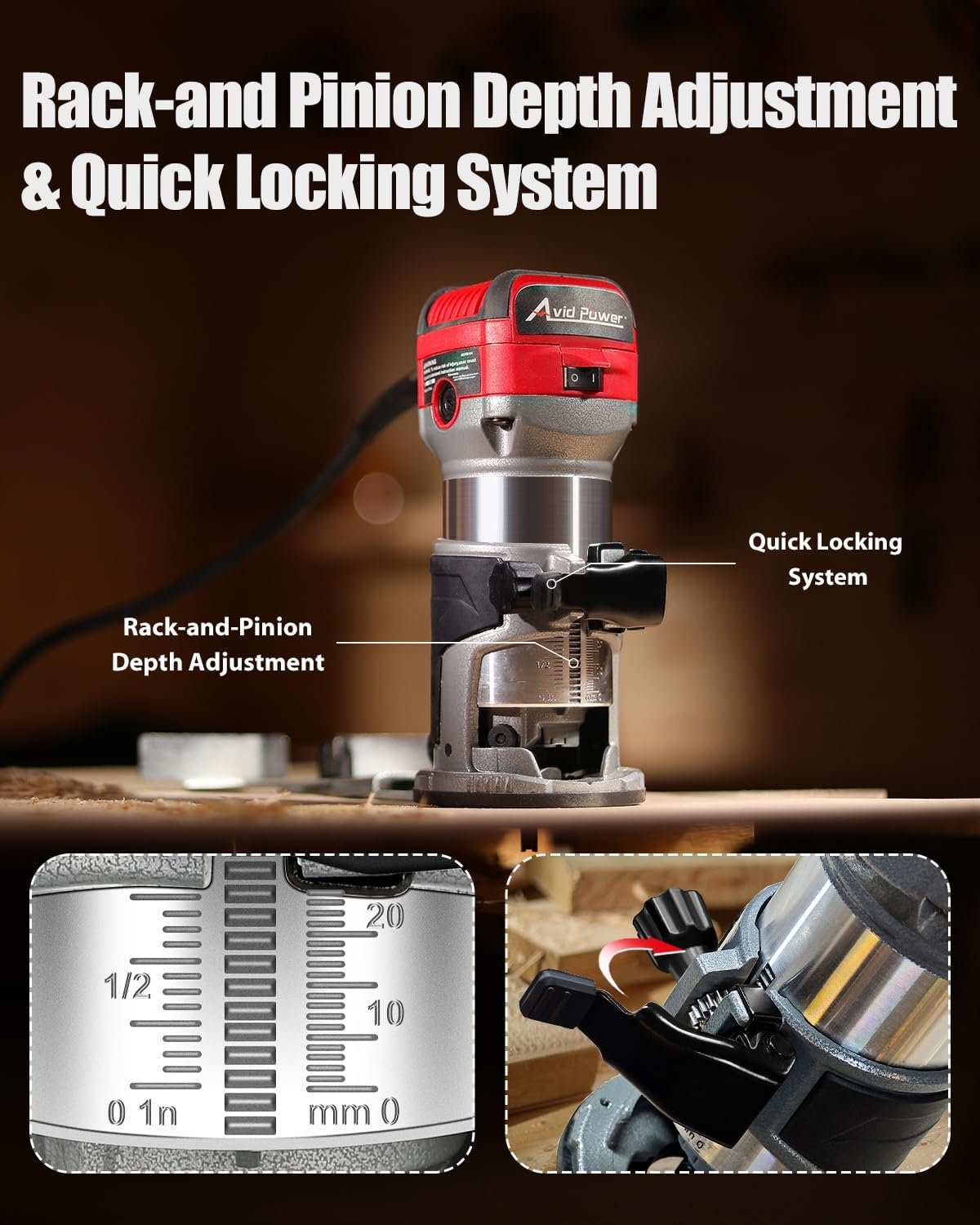 Precise Operation & LED Lights – Smooth rack-and-pinion depth adjustment system ensures precise operation for a range of cabinetry and woodworking applications; Dual bright LED lights illuminates dark working areas