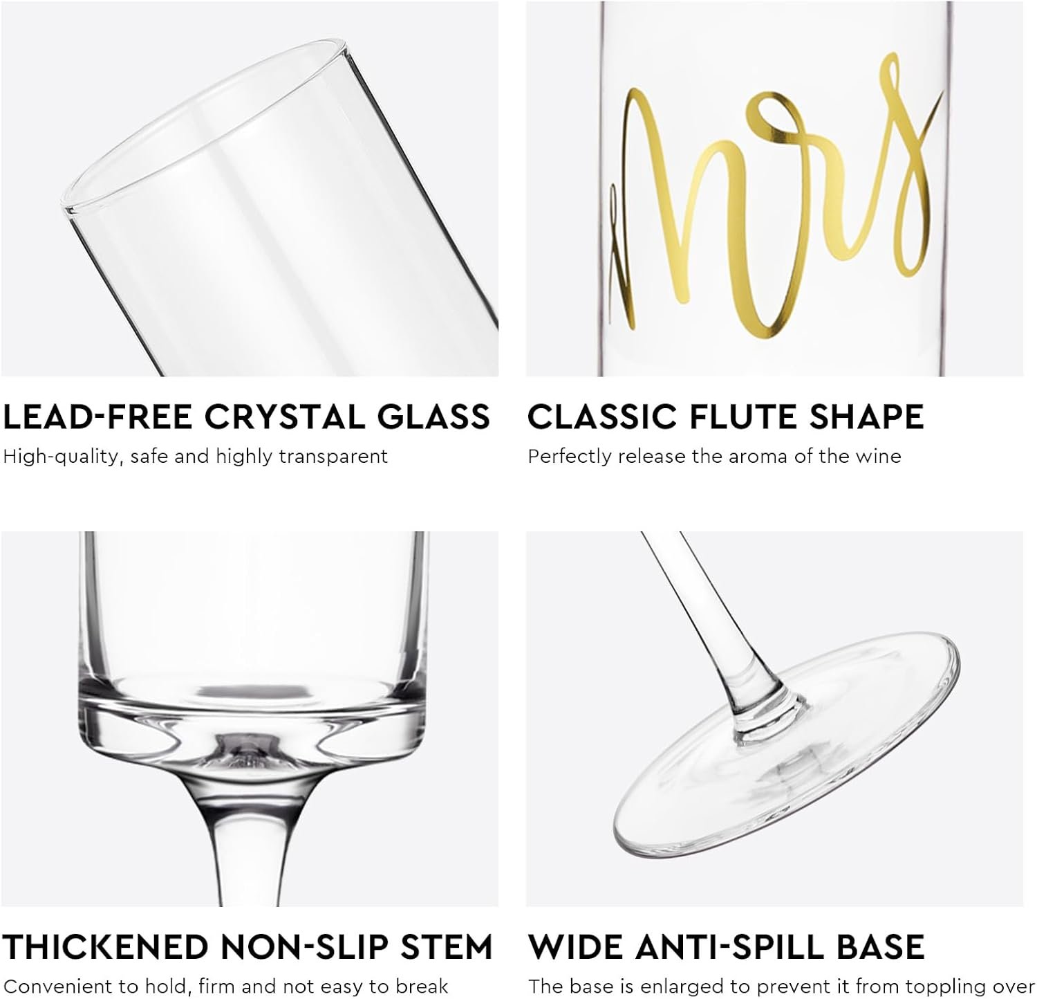 Premium Quality: Smooth & thin laser cutting rim and solid & flat unibody design make wedding champagne flutes feel great to hold, while retaining the original taste of the drink. Perfect as a special gift for the bride and groom.Trendy and modern style ensures they will never go out of style.