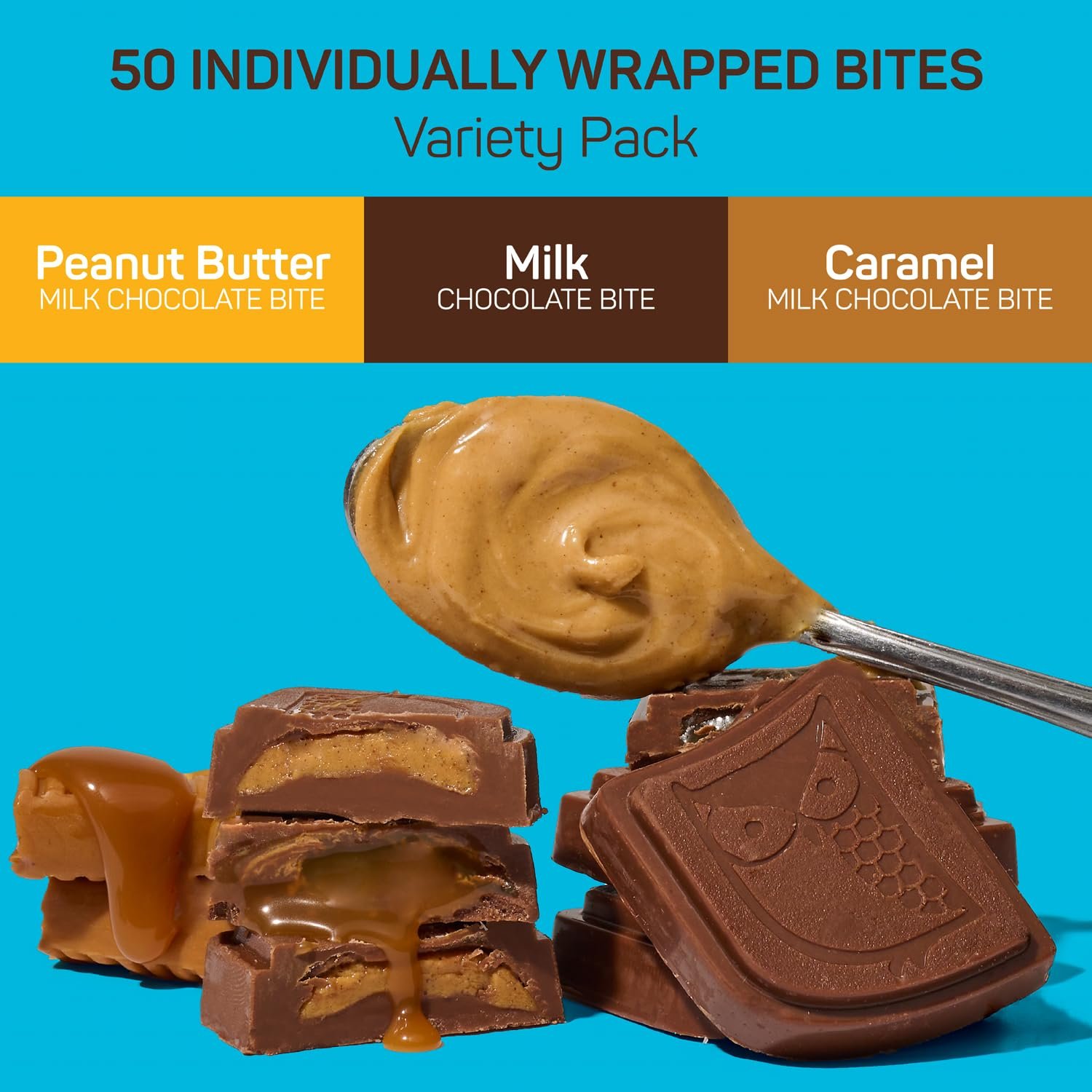Original Bites Variety Pack – Variety is the spice of life, friends. Put a pep in your step with a mix of our beloved Caramel, Peanut Butter, and Milk Chocolate Bites! Includes 50 individually wrapped bites made with premium fairtrade chocolate.