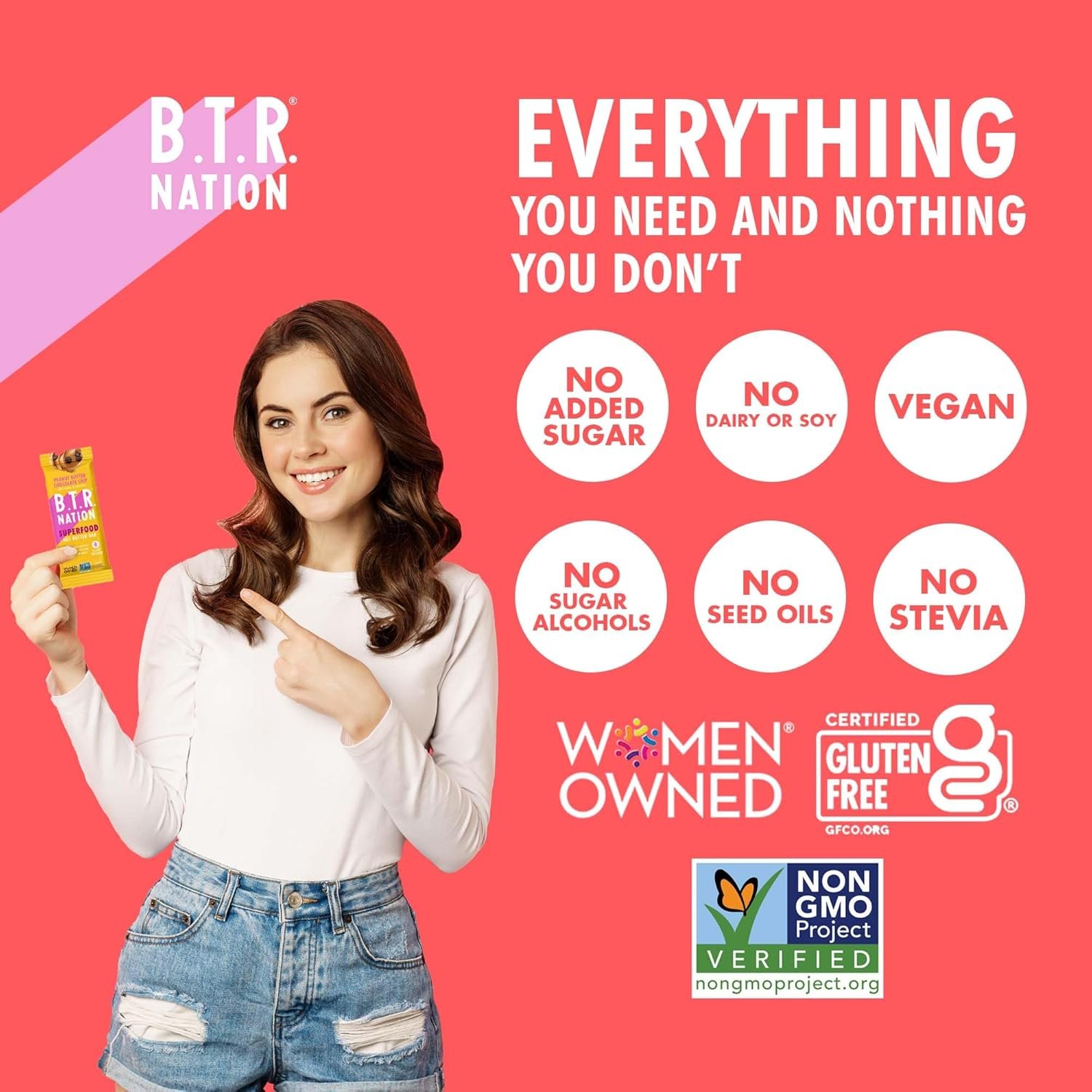 NO JUNK, EVER. WE PROMISE: B.T.R. Bars are Non-GMO, Gluten-Free, Dairy-Free, and Soy-Free with a 100% Clean Label. No sugar alcohols, no stevia, no gums or emulsifiers, and no flavors (not even so-called ‘natural flavors’)