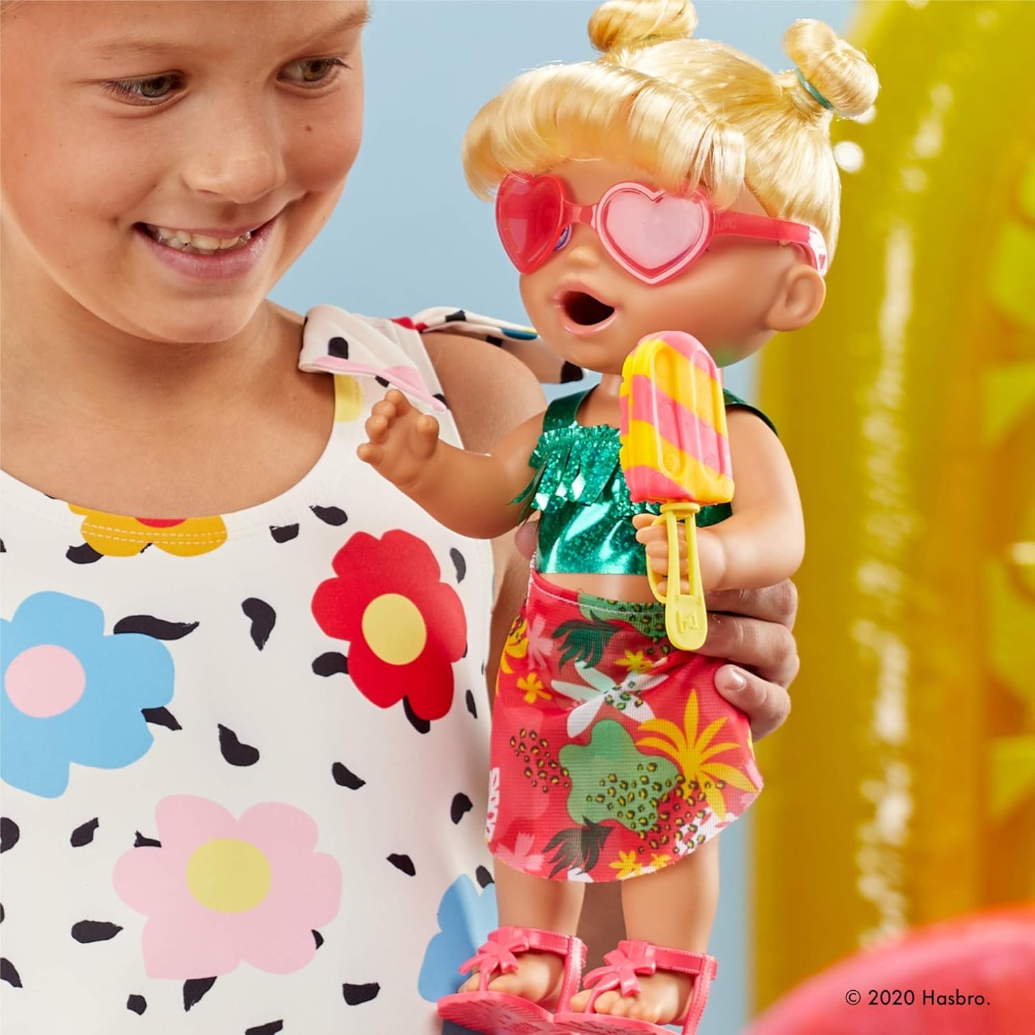 It’s the first Baby Alive doll to feature both feeding and waterplay! With the included solid reusable doll food, ice pop mold and stick, kids can make ice pop shapes to feed Baby Alive Sunshine Snacks doll! The click-change⢠diaper flap also makes changing-time a breeze for this baby doll that eats and “poops.” Simply pop open the plastic-molded diaper’s flap, empty it, then play again! Before waterplay, remove all solid doll food using the diaper flap and back compartment. Then Sunshine Snacks doll is ready to go! Doll includes a removable swimsuit top and sarong, sunglasses, gladiator sandals, 2 solid doll food containers, ice pop mold and stick, fork/spoon combo and comb. With her cute, summer-themed doll clothing and accessories, Baby Alive Sunshine Snacks doll makes a hit birthday or holiday gift for kids! It’s a great toy for girls and boys ages 3 and up.