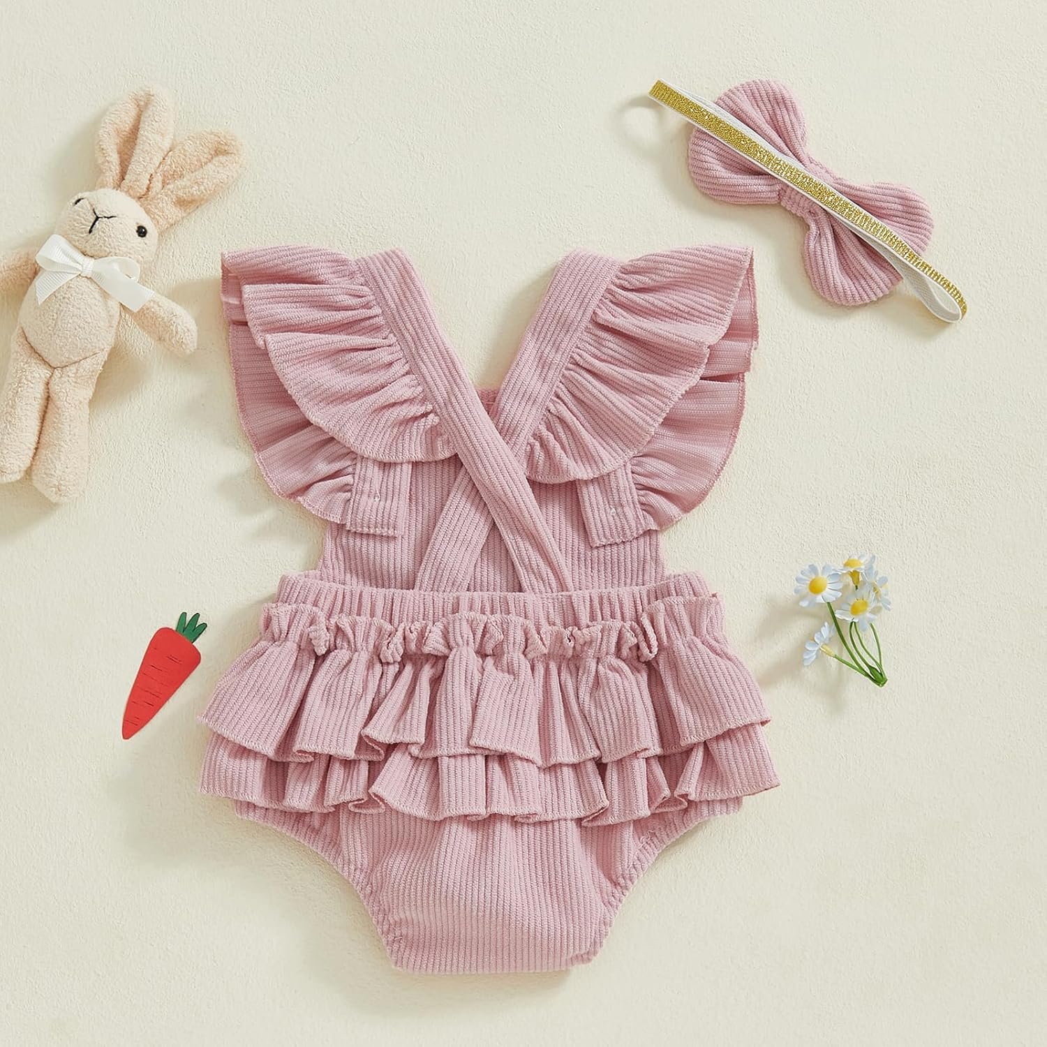 Baby Girl Valentine’s Day Outfits Ruffle Sleeveless Heart Embroidery Romper with Headband Set Newborn Clothes