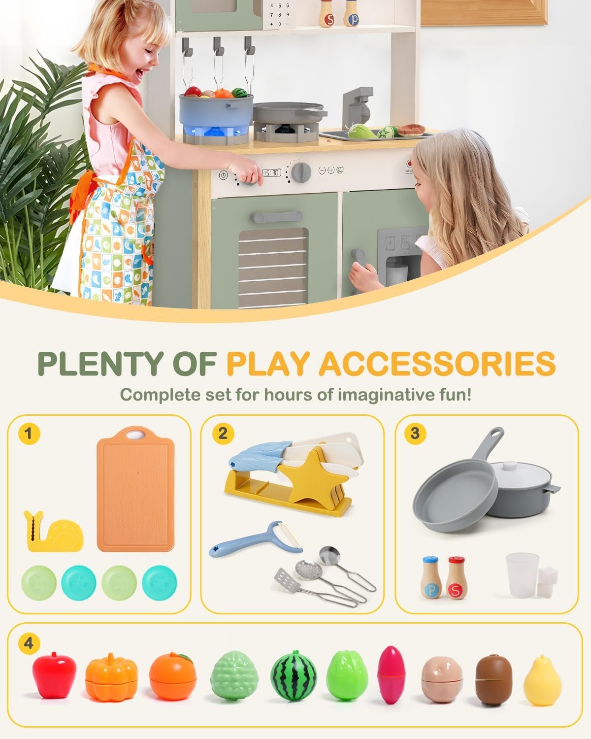 Premium Wooden Play Kitchen: Crafted from high-quality wood, this kitchen playset is designed for durability and smooth play; suitable for children ages 3 and up