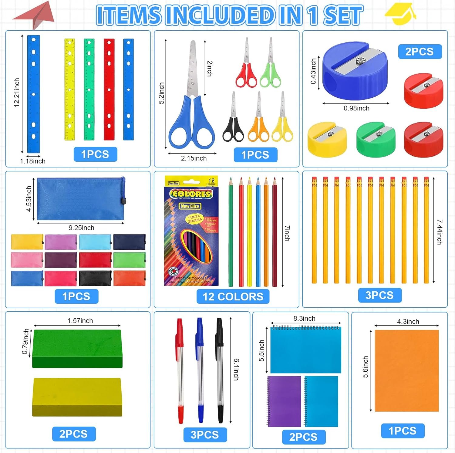 Comprehensive Back to School Supplies: This 1 Set Back to School Supplies Bundle Kit for Kids Bulk is the perfect solution for all your school supply needs. Include 3 pieces Pencils, 1 pieces Rulers, 1 pieces color Pencils, 3 pieces Pens, 1pieces Pencil Pouches, 1 pieces Safety Scissors, 2 pieces Sharpeners, 2 pieces Erasers, 1 pieces A6 Notebooks, 1 pieces A5 Notebooks, this kit has everything your child needs for a successful school year