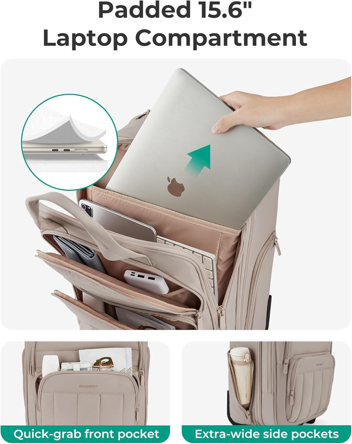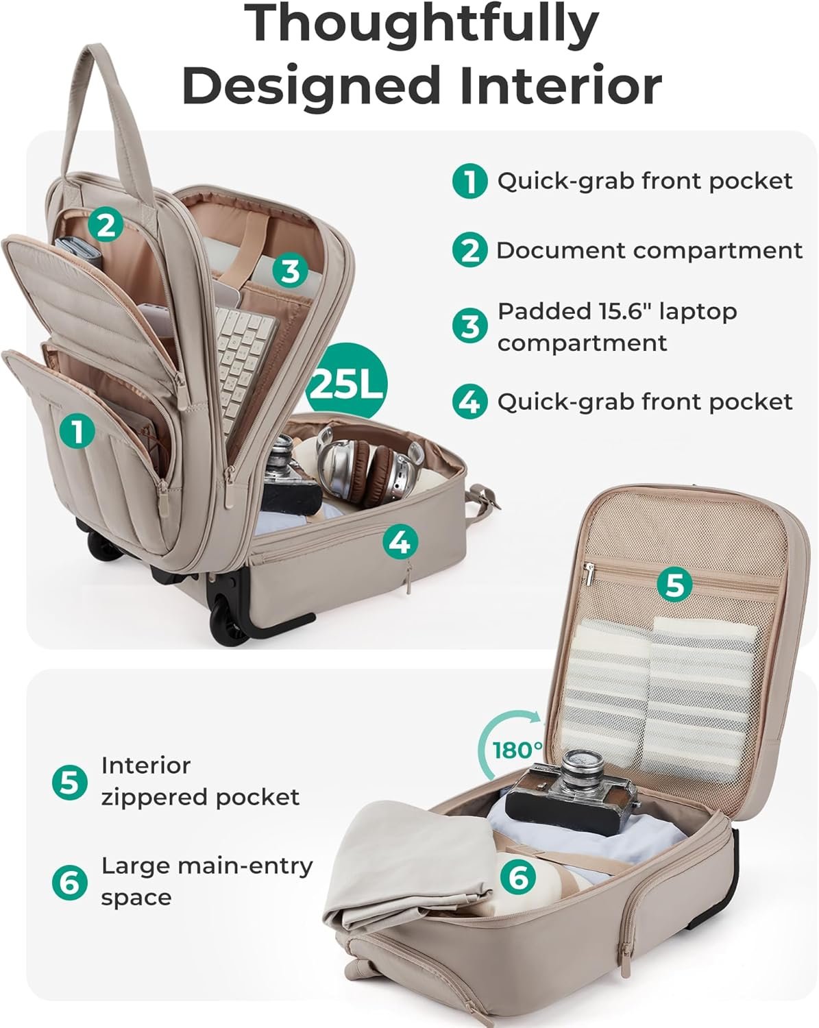 Organized Storage: Effortless organization is achieved with ample storage, internal compartments, and a small zippered pocket for smaller items. The padded laptop compartment fits up to a 15.6-inch laptop. Making it an ideal carry-on for 2-3 day overnight trips.