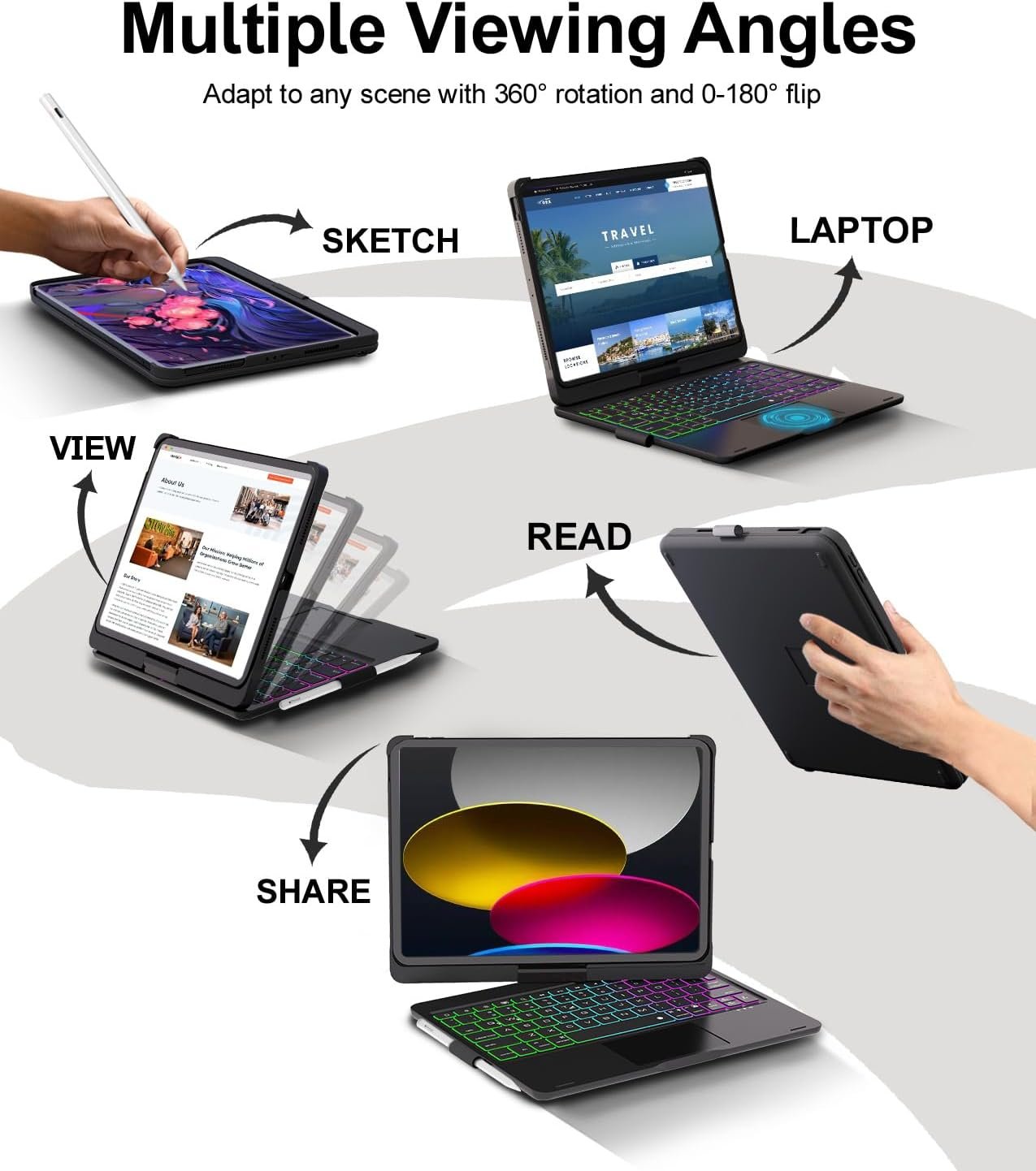 Multiple Viewing Angles – iPad Air 11 inch case with keyboard supports 360° rotation and 0-180° flip, effortlessly adjusting to the most comfortable viewing angle. Whether you’re a professional, a writer, or frequent traveler, our iPad 11 inch case with keyboard is designed to meet your needs