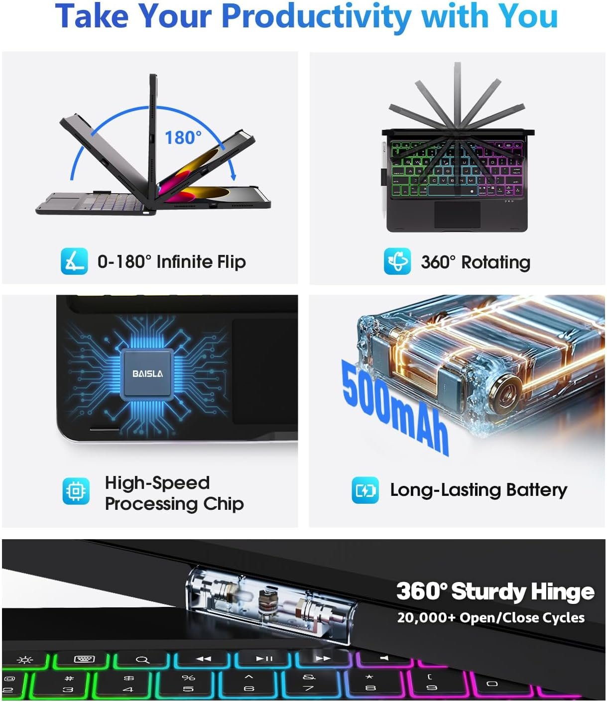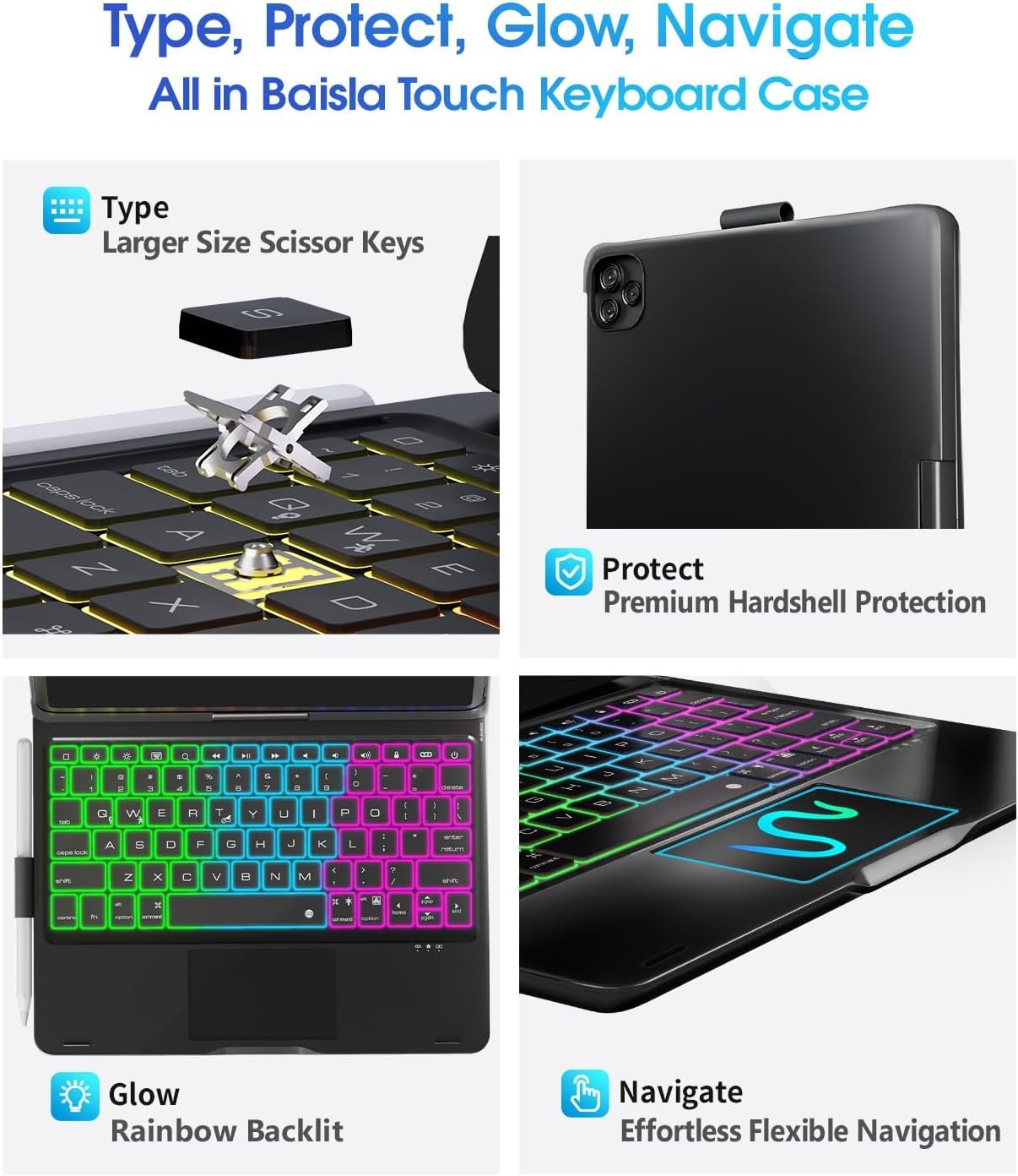 Rainbow Backlit – Illuminate your workflow with vibrant rainbow backlight, iPad 11th generation case with keyboard features 3 adjustable brightness levels. You can customize brightness and backlight color to suit your preferences and habits. Enjoy a sleek and stylish setup with Baisla ipad Keyboard 11th generation 11 inch with pencil holder