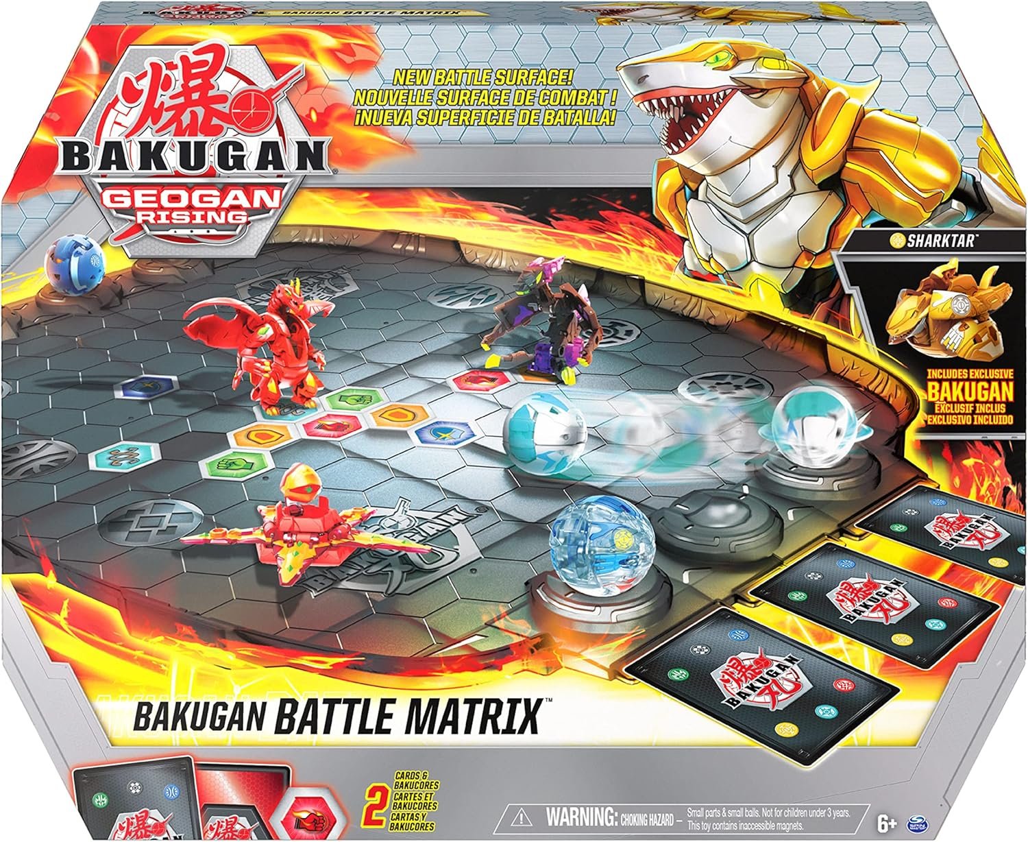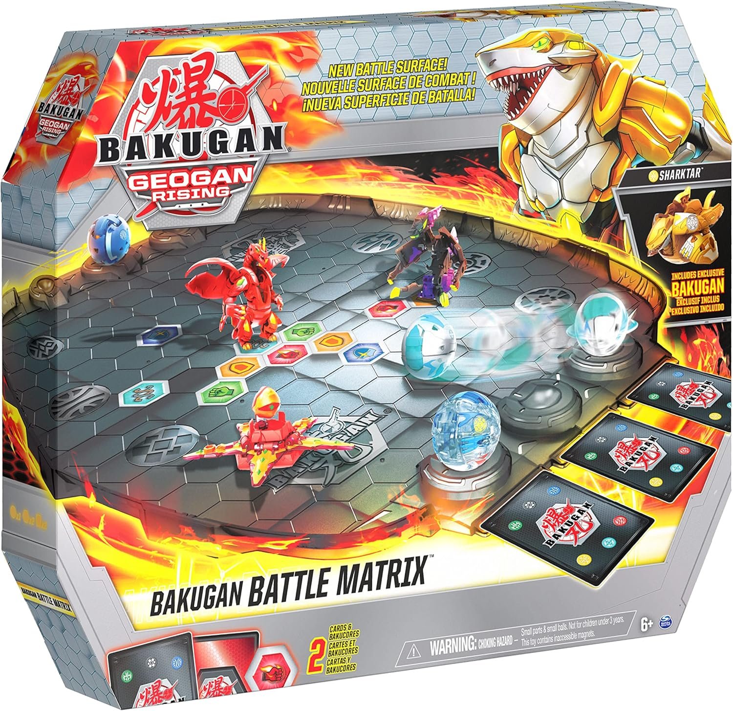 Battle like a true champion with the Bakugan Battle Matrix! Featuring an exclusive gold Sharktar Bakugan, a premium solid battle surface, banked walls and staging areas to hold your Bakugan until you’re ready to roll and transform, this epic arena is the ultimate way to brawl! With a hexagonal grid already on the board, it’s easy to lay out your BakuCores (two included) for an exciting battle. Face off against an opponent and roll your exclusive Sharktar Bakugan into pop open Baku-Action, directly off one of the staging area’s ramps! Keep your brawlin’ contained with the Battle Matrix’s banked walls and pull off epic trick shots! Store your cards in the slots and stay organized while you battle. Plus, you can even add a new element to your brawls with the Geogan (each sold separately) – these mysterious new Bakugan characters feature new shapes and unique transformations for even more battling power! The Bakugan Battle Matrix brings the thrill of the brawl to life and is the perfect addition to your collection. Bring home the Bakugan Battle Matrix and take your battles to the next level!