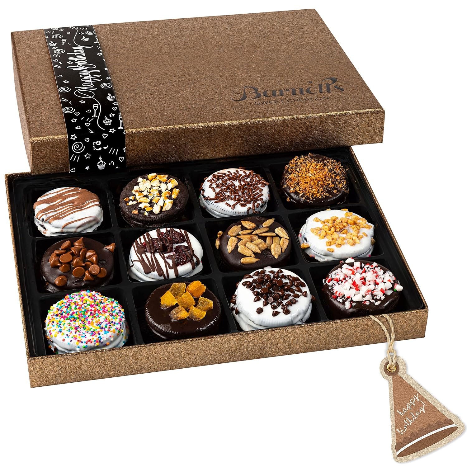 SPECIAL GIFT FOR HER: Barnetts exquisitely crafted, hand dipped chocolate sandwich cookies are CRC Kosher certified and dairy free. Toppings include chocolate craisin, chocolate chip, caramel chip, nut crunch, almond crunch, cookie crunch, papaya, sunflower seeds, sprinkles, and more!