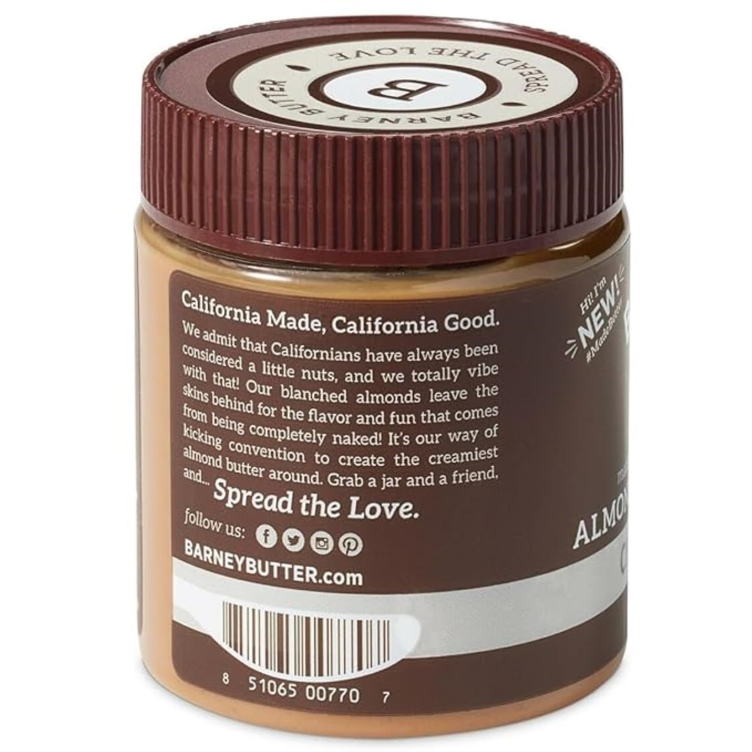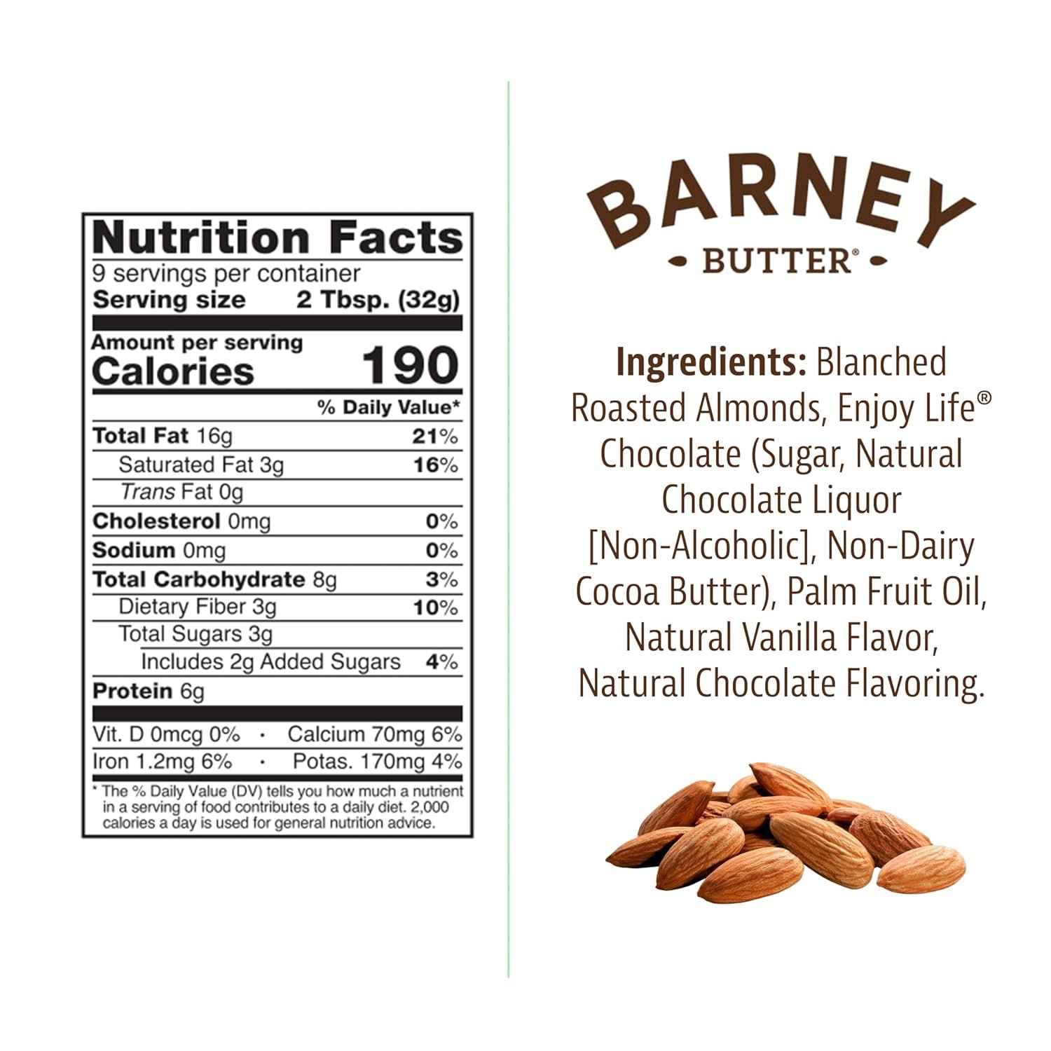 MADE IN AMERICA WITH CALIFORNIA ALMONDS Our “original, classic”, super-smooth, and spreadable Barney Almond Butter, blended with melted Enjoy Life chocolate. Delicious chocolate taste, and only 3 grams of sugar per serving.
