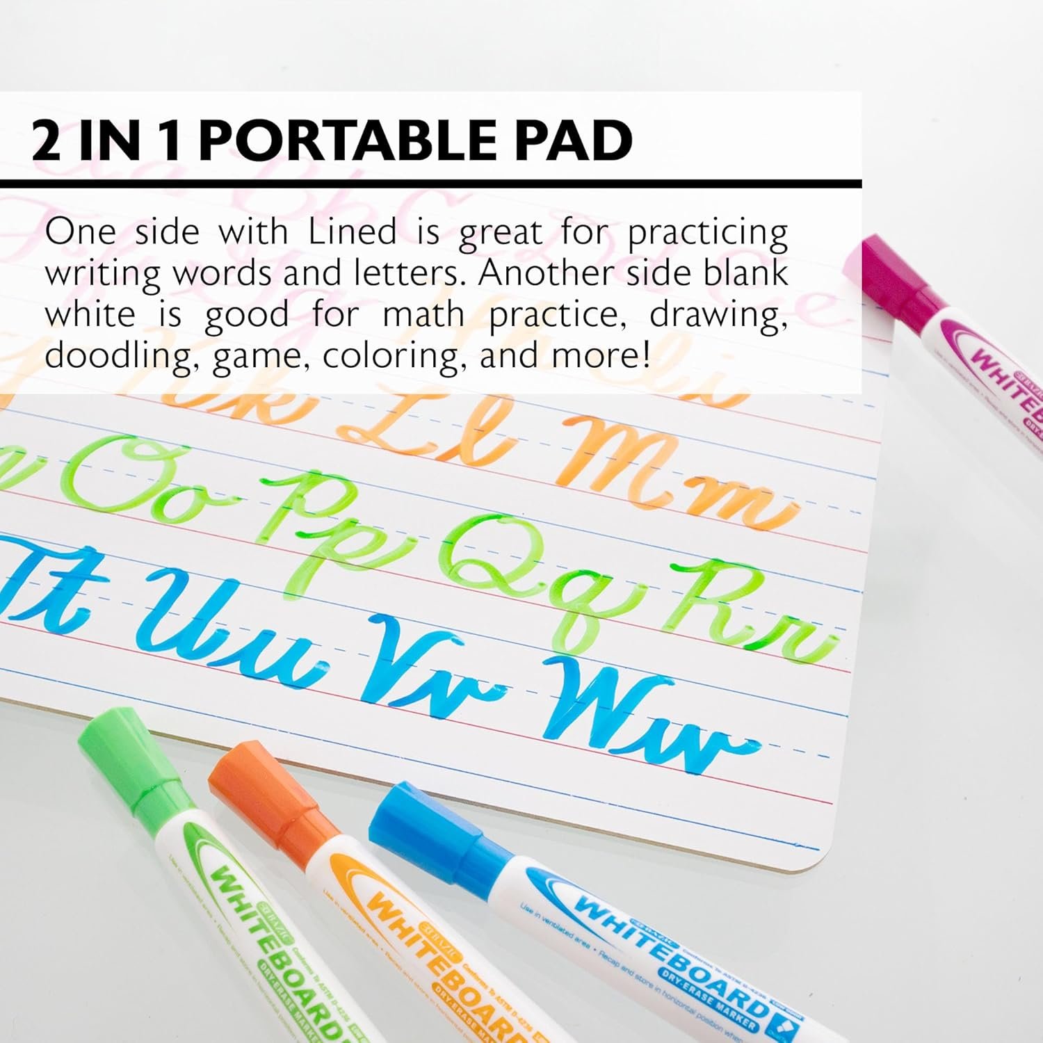 ⭐ 2 IN 1 PORTABLE PAD. One side is lined which is great for practicing writing words and letters. Other side is blank white which is good for math practice, drawing, doodling, game, coloring, and more! Endless possibilities and great for diverse users!