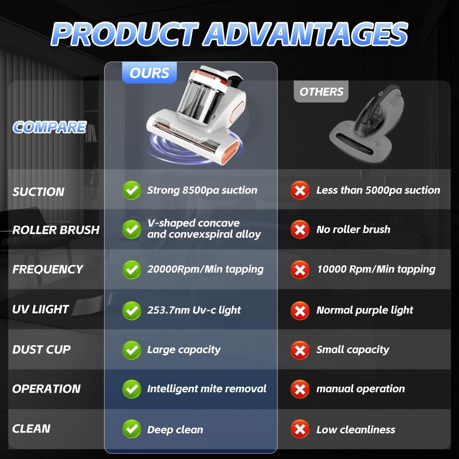 🚀【Efficient Cleaning】The mattress vacuum cleaner is equipped with a powerful 400W motor, 8.5Kpa suction, 13000/min high-frequency beating, and 8.7-inch widened suction port, which can effectively save your time and energy and easily remove deep dust and pet hair.
