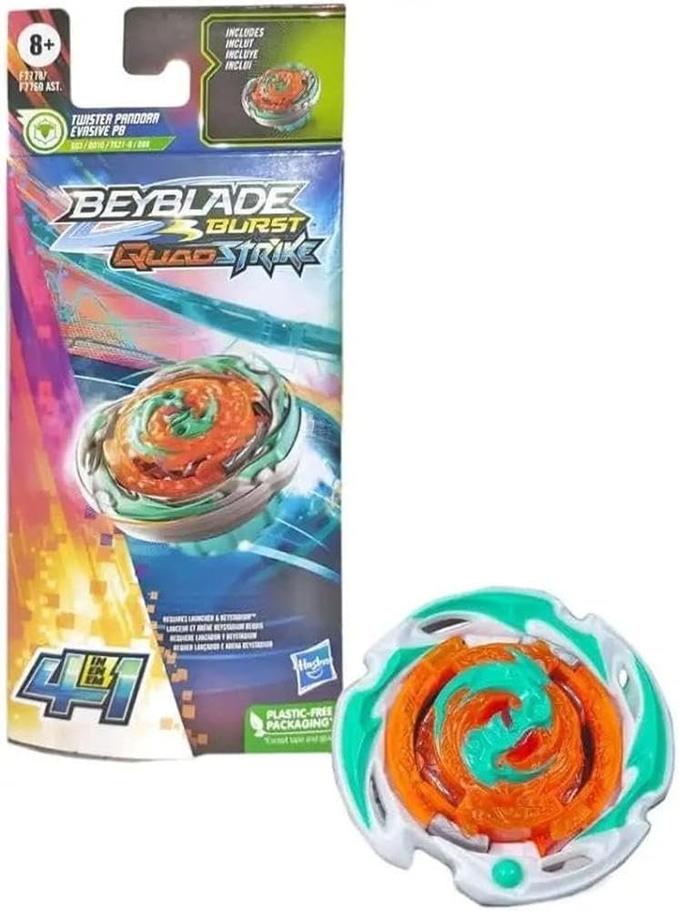The battle has taken to the next level with the unique Beyblade Burst QuadStrike Twister Pandora Evasive P8 Pack! With Beyblade spinning tops for 8-year-old boys and girls, kids can trigger fierce strikes and defeat their opponents with more intense clashs.