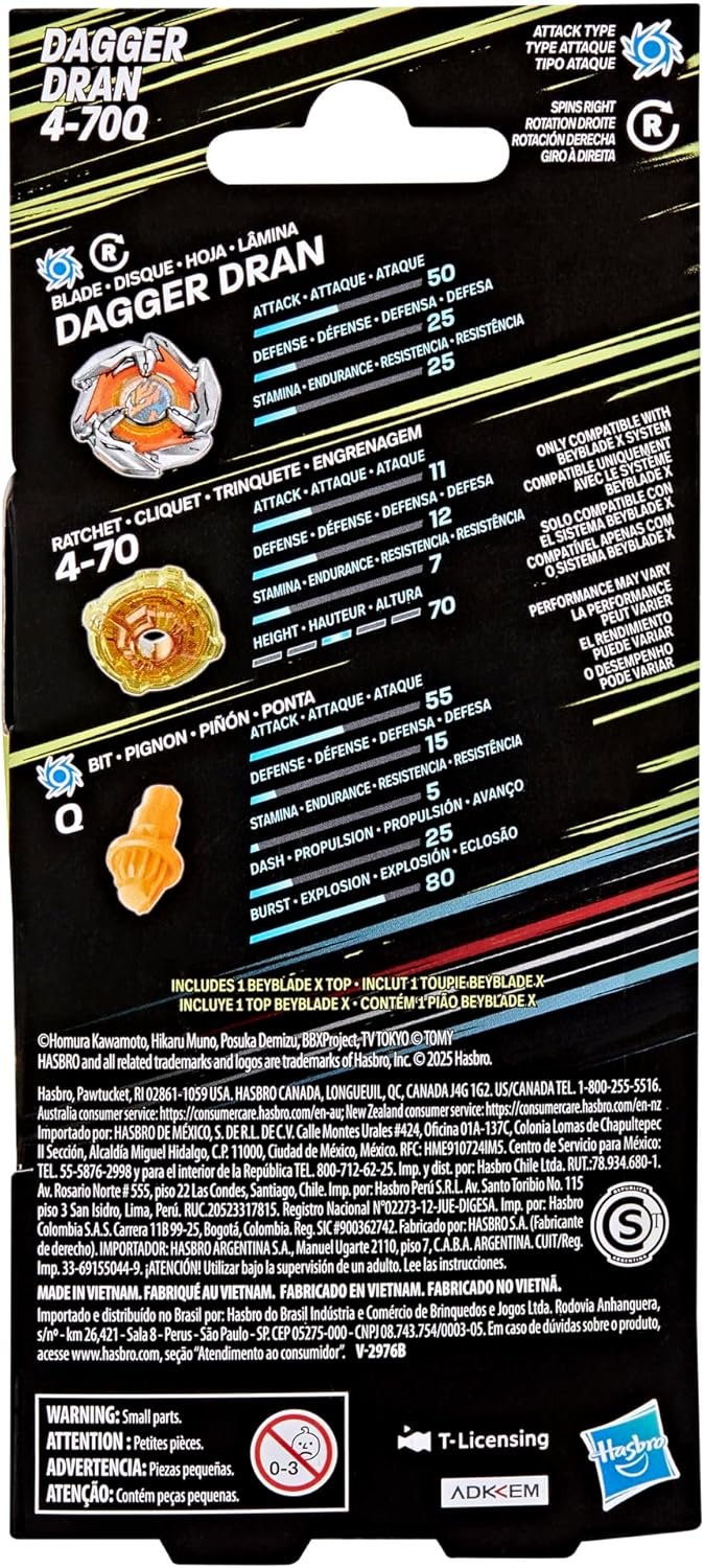 Experience Beyblade X, the next generation of Beyblade stadiums, launchers, and tops! The Beyblade X Dagger Dran 4-70Q Booster Pack Set includes 1 right-spinning Attack Type top (Beystadium and launcher required, sold separately). Launch right into battle or reconfigure the interchangeable blade, ratchet, and bit of this Booster Pack with those of other Beyblade X tops (sold separately) to create your own unsurpassable top. Beyblade X features the X-Celerator Gear System: The gear of a Beyblade X top engages the rail of the Beystadium arena, super-accelerating the top into an Xtreme Dash around the stadium for crushing collisions and epic bursts. Launch your tops into fierce clashes against opponents’ tops, scoring points with each confrontation – first to score 4 points wins. Hasbro Beyblade toys with authentic Takara Tomy die-cast metal tops make great kids gifts for boys and girls ages 8 and up. HASBRO and all related trademarks and logos are trademarks of Hasbro, Inc.