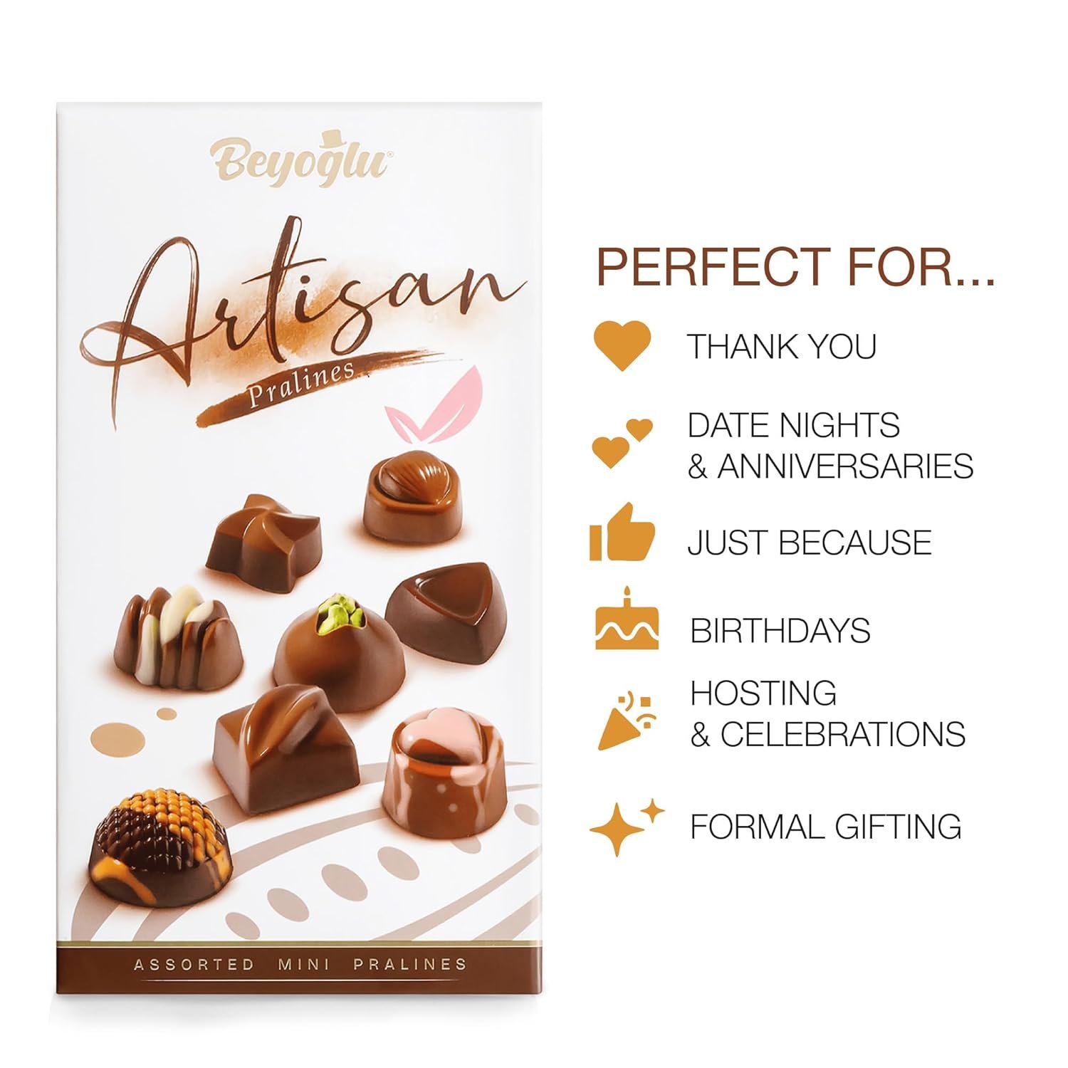 Beyoglu Artisan Premium Assorted Mini Chocolate Pralines (80g) Discover the elegance of fine chocolate craftsmanship in a perfectly sized assortment. Beyoglu Artisan Premium Assorted Mini Chocolate Pralines bring together a refined selection of bite-sized chocolates, thoughtfully curated to showcase the artistry of Turkish confectionery in a gift-ready presentation. From the first glance to the final bite, Beyoglu Artisan Pralines invite you to slow down and savor. Enjoy them alongside a rich Turkish coffee, share them with guests, or treat yourself to a moment of refined indulgence—luxury that feels special yet accessible. A Curated Collection of Flavor & Craft This is more than an assortment—it’s a celebration of texture, flavor, and design. Inside, you’ll find smooth milk chocolate shells filled with indulgent hazelnut cream, silky caramel, and delicate pistachio notes. Each praline is crafted with attention to detail, offering a balanced and sophisticated tasting experience in every bite.