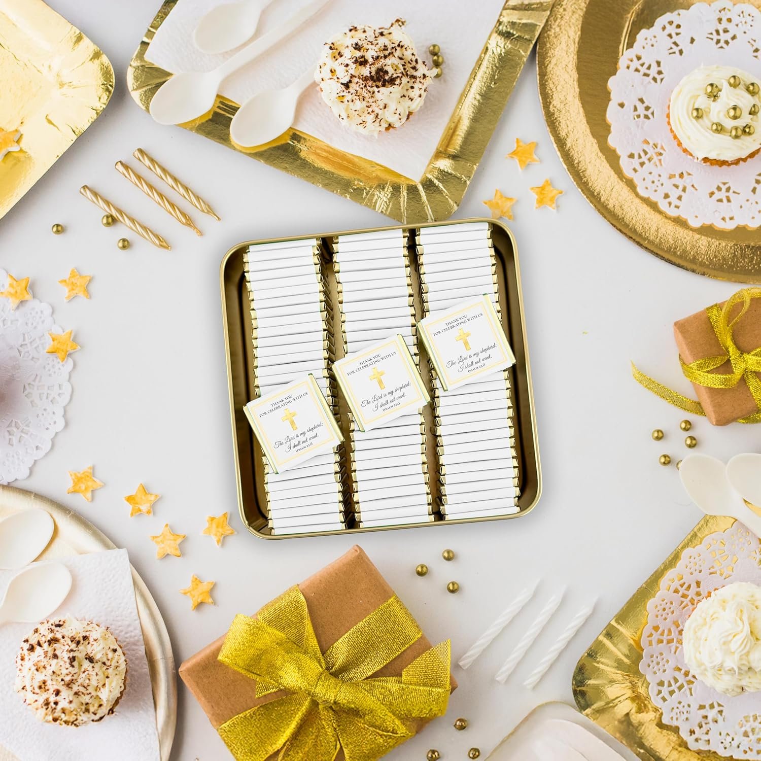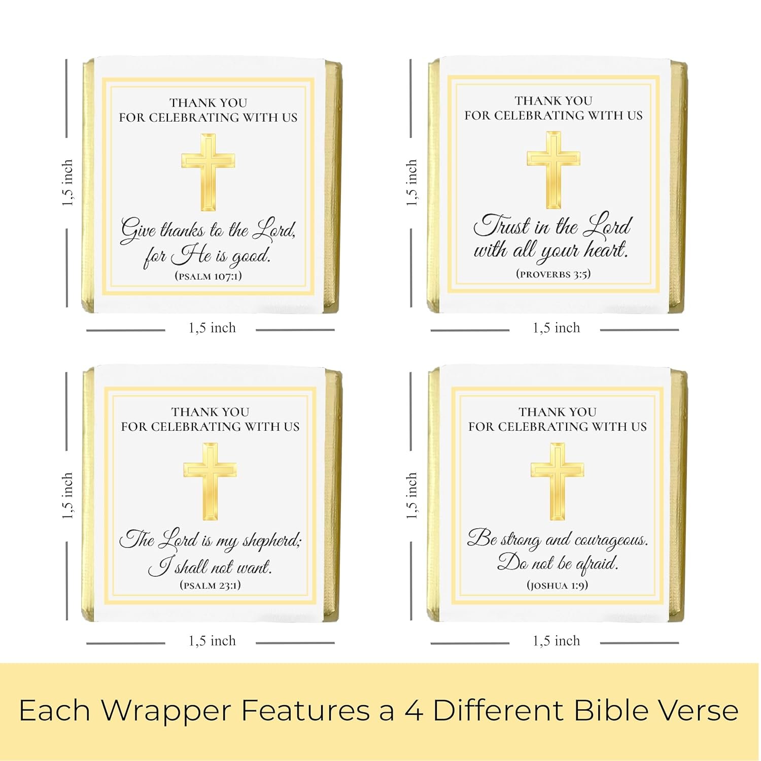 PREMIUM QUALITY & DELICIOUS CHOCOLATES – Crafted from smooth and creamy milk chocolate that melts in your mouth, offering a delightful treat for guests. The elegant gold and white scripture-themed wrappers add a touch of faith and sophistication to your event.