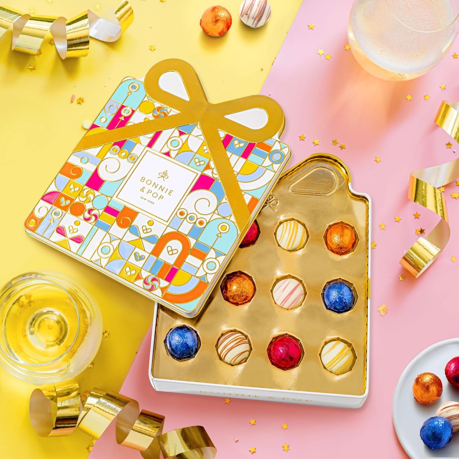 The Birthday Chocolate Truffle Box includes 12 silky smooth chocolate truffles in decadent varieties like mocha, raspberry, coconut, caramel, and more.