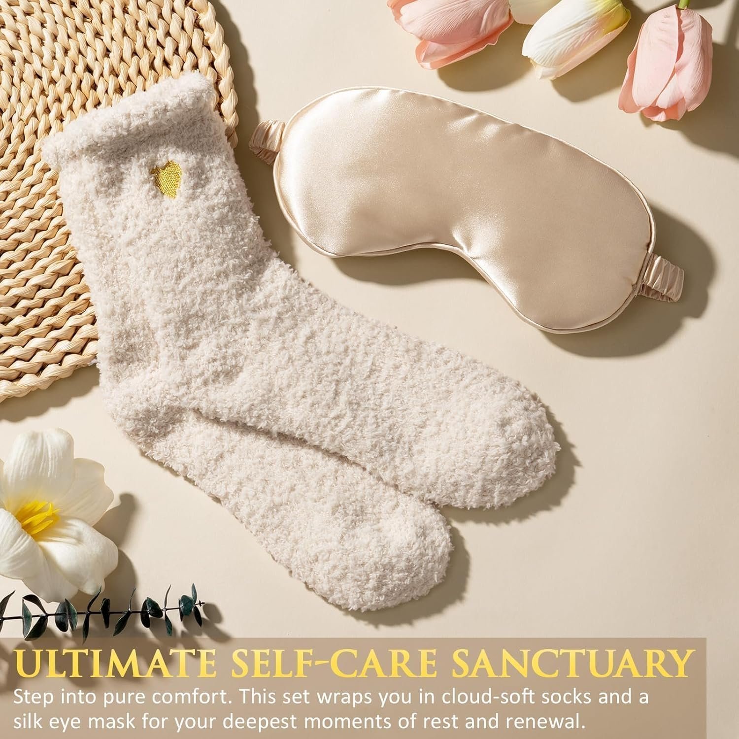SELF CARE GIFTS FOR WOMEN: MAYICIVO Christmas Mothers Day Birthday Gifts for Women mom sister wife girlfriend friends coworkers teachers nurses boss come with a silk eye mask and fuzzy socks. The fuzzy socks are soft and comfortable, wrapping your feet in softness; and the soft eye mask helps soothe eye fatigue and provides a ultimate relaxing rest. Perfect as care package relaxation gifts cozy stress relief gifts for women to deliver unmatched loving care and offer her a moment of pure bliss