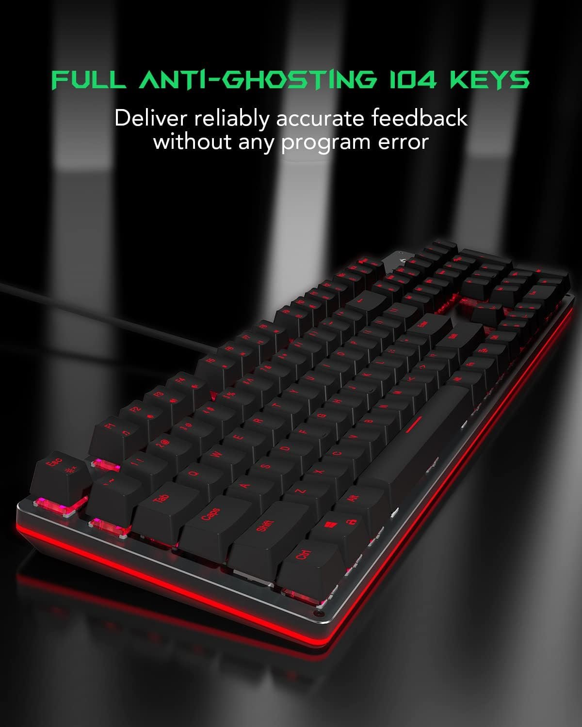 【N-Key Rollover & Programmable】The PC gaming keyboard is with fully conflict-free 104 keys that ensures the accuracy for simultaneous key presses during intense gameplay and fast typing. All key can be reassigned and macros can be created for effortless operation.