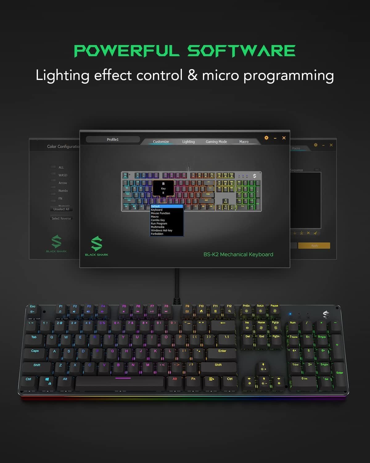 Macros setting, backlight design, keys customization and keys disabling. Download via (global.blackshark.com/pages/download)