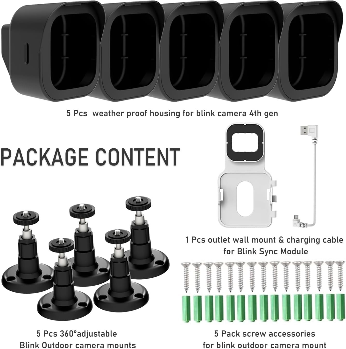 Package Count: Premiun quality weather proof housing x 5, 360° swivel and 90° tilt Blink Outdoor camera mount x 5, outlet wall mount for Blink Sync Module 2 x 1, customized short USB cord x 1, screw accessories x 1 set. (NOT include camera, blink sync module and AC adapter)