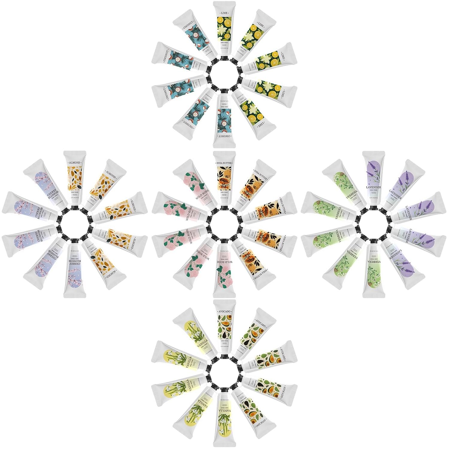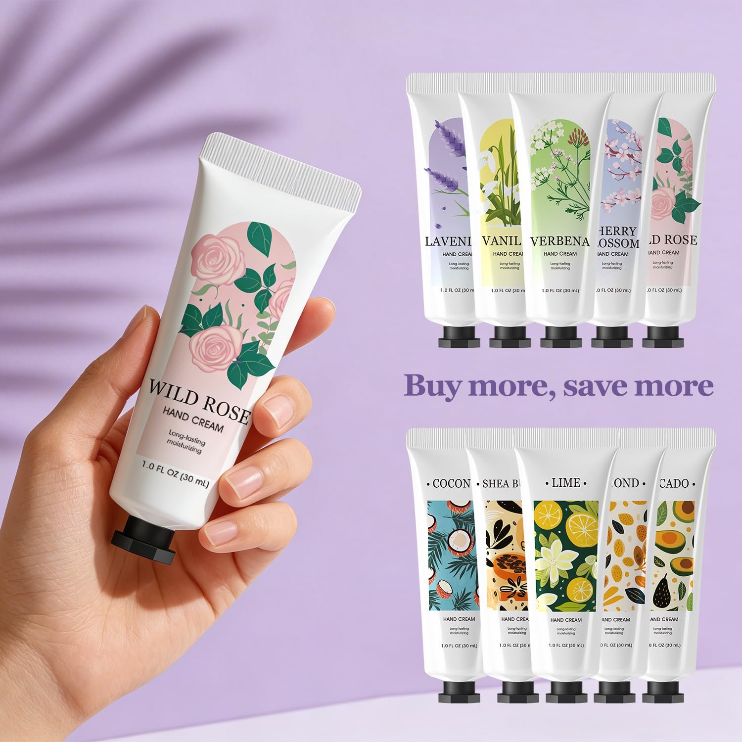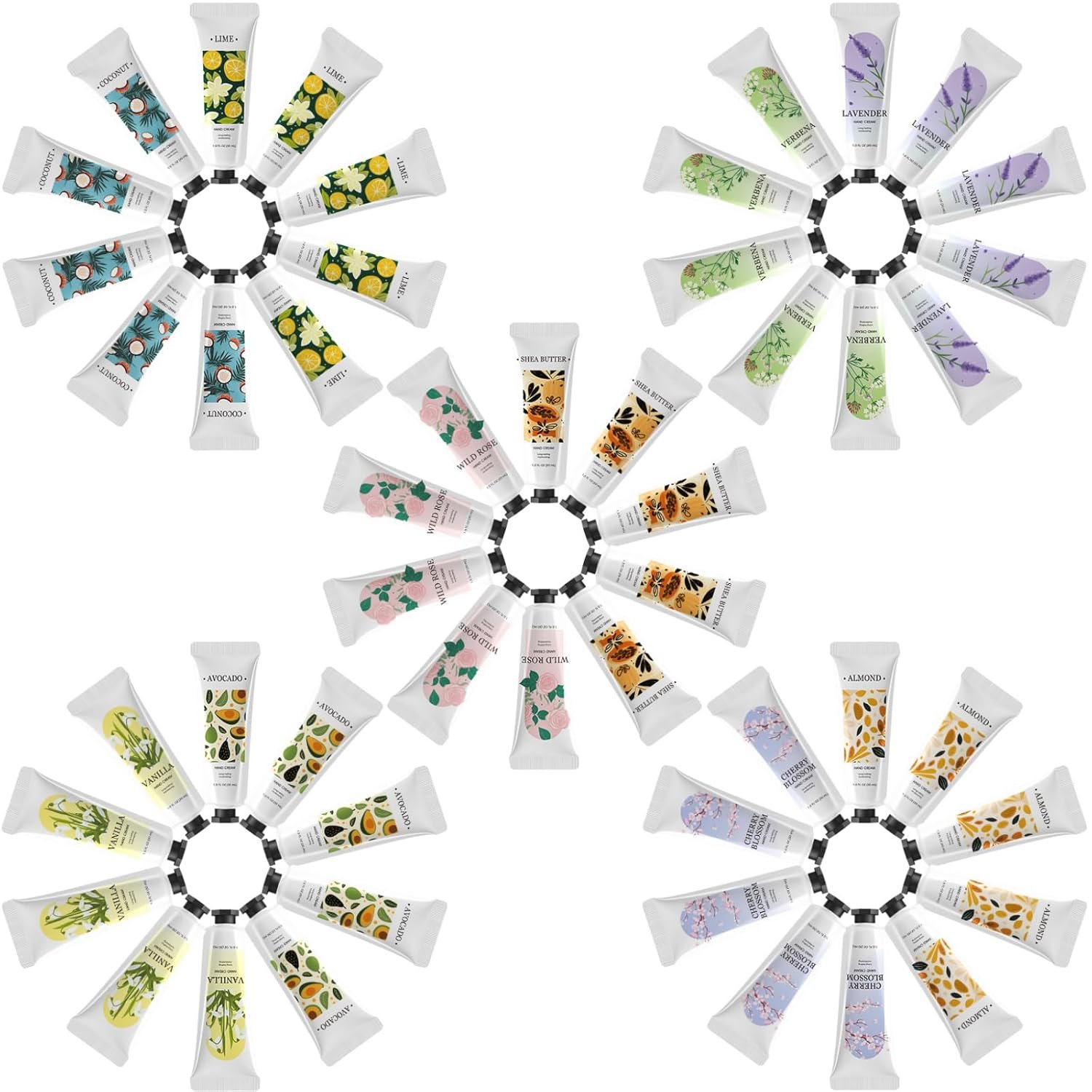10 Refreshing Scents, 50-Pack Variety. This hand cream set includes 10 natural fragrances: Lavender, Vanilla, Verbena, Cherry Blossom, Wild Rose, Shea Butter, Coconut, Lime, Avocado, and Almond. Each scent is light, refreshing, and perfect for different moods and occasions. Whether you prefer calming florals, sweet treats, or tropical vibes, there’s a mini hand lotion for every day
