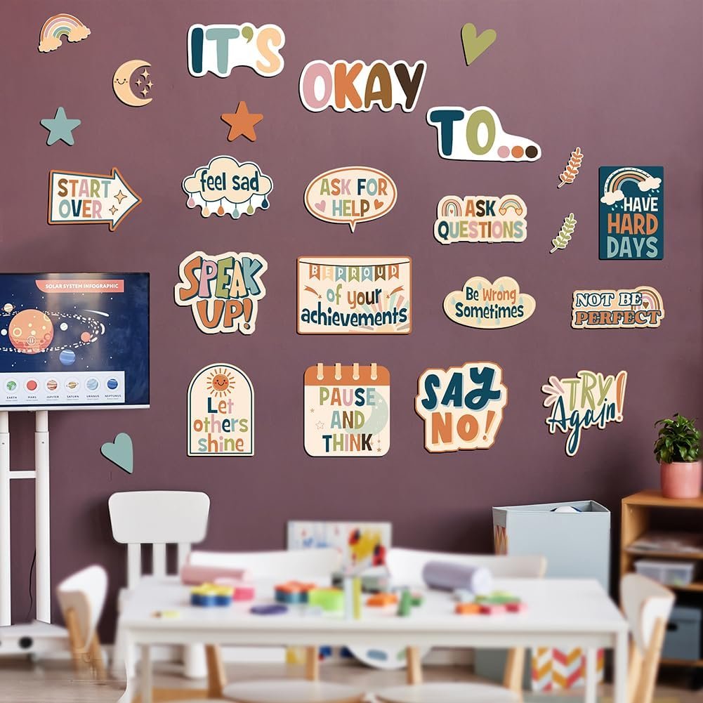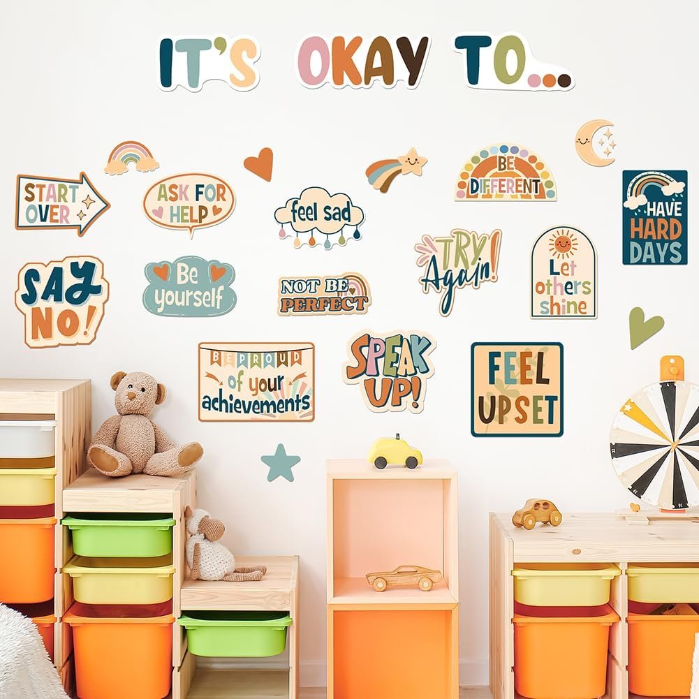 BOHO MENTAL HEALTH POSTERS DECOR: Discover the joy of self-expression with the IT’S OKAY TO Classroom Bulletin Board Set. This pack of inspirational posters for classroom or office includes 20 positive affirmation posters like “Be different” and “Ask questions” along with 16 accents. With 80 adhesive dots, you can easily decorate and inspire your boho classroom, home, or Speech therapy office decor, this school bulletin board decorations kit for teachers encourages everyone to be their true selves