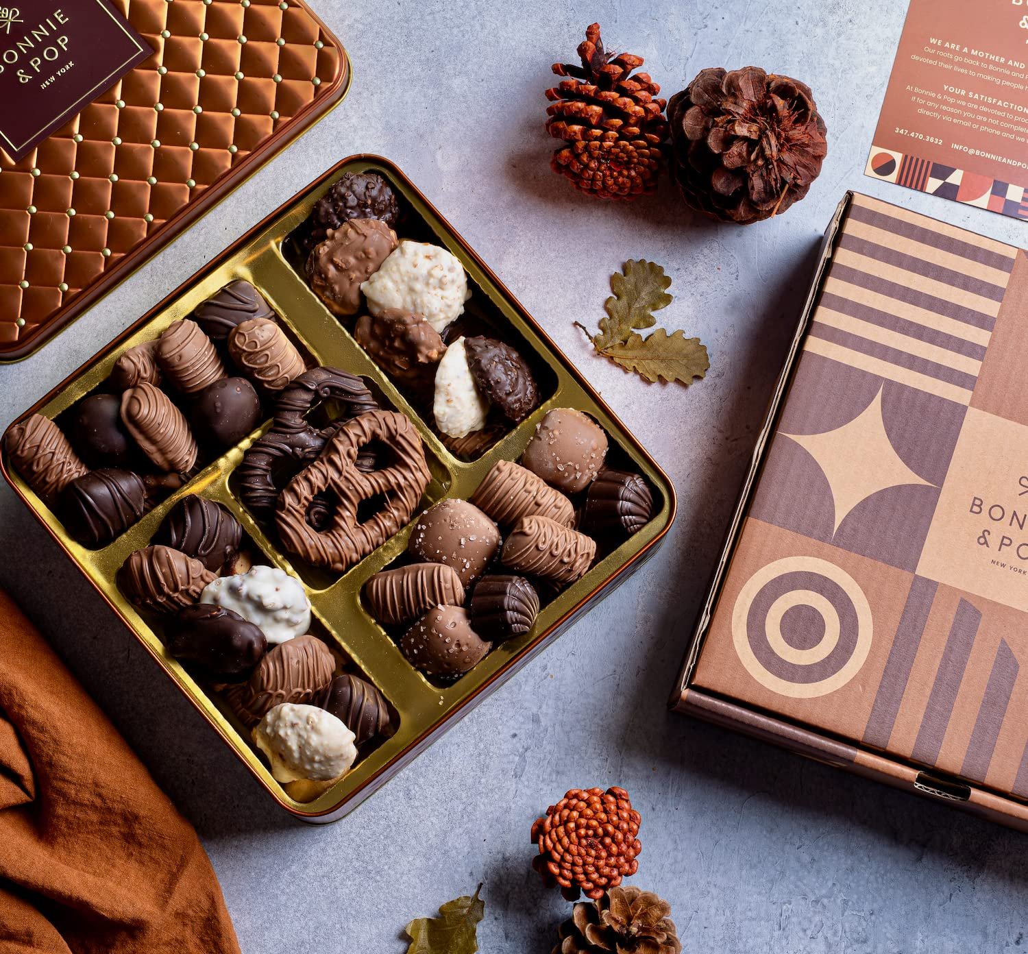 🍫 AN INDULGENT SELECTION OF OUR FINEST CHOCOLATES – Gift baskets arrive with more than a pound of assorted milk, dark and white truffles. Flavors include: Milk Butter Pecan Patties, Cashew Clusters, Pretzel Clouds, Pecan Snappers, Sea Salt Caramels, English Toffee, Peppermint Patties, Bavarian Pretzels, Double Silk Truffles, Coconut Haystacks, and Peanut Clusters.