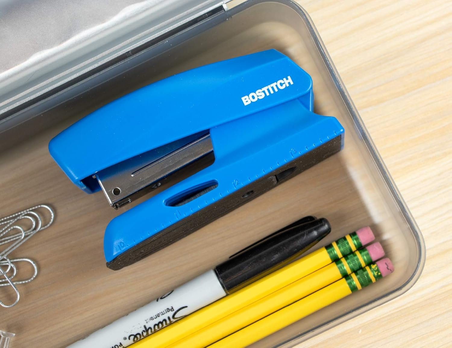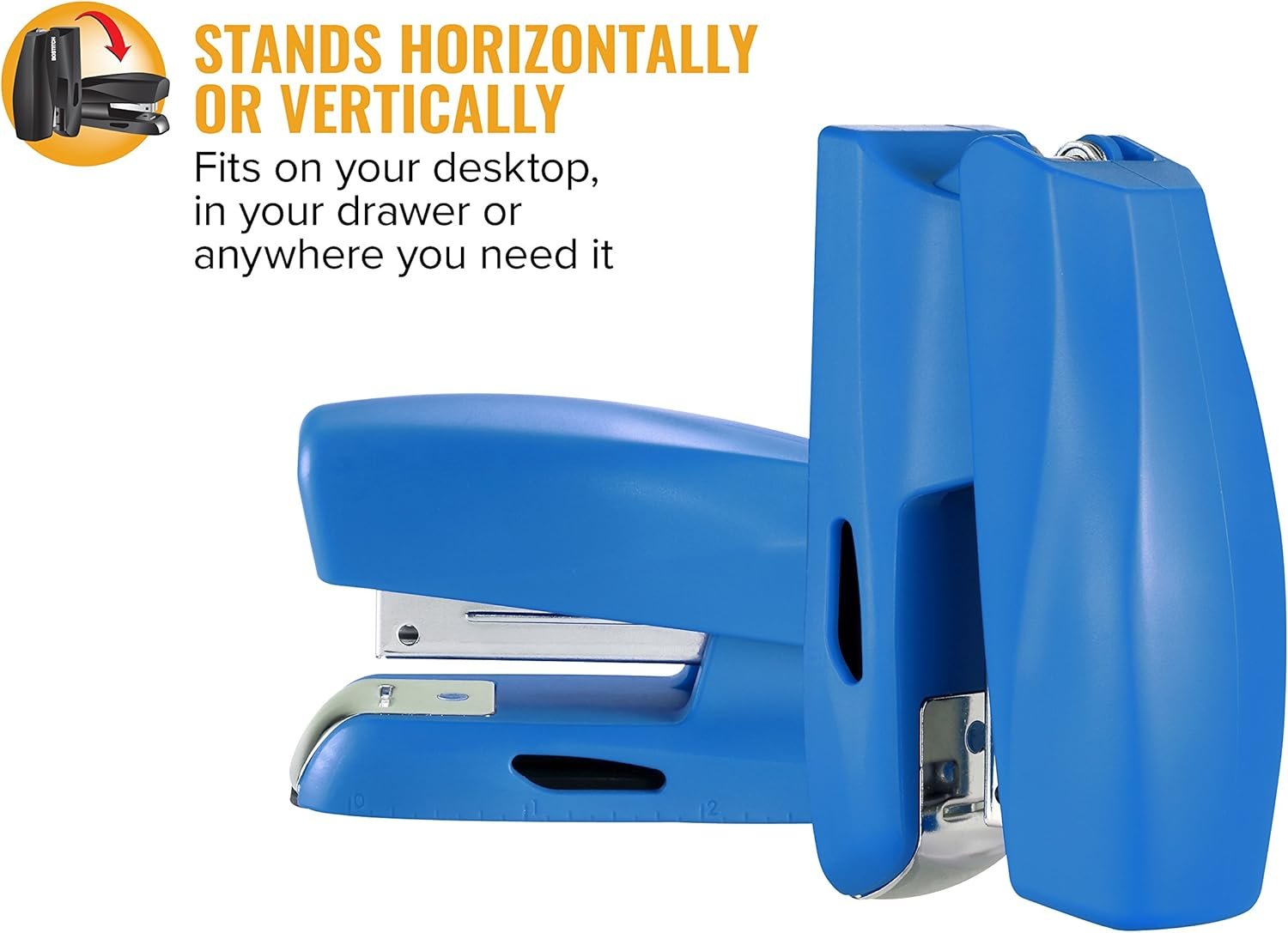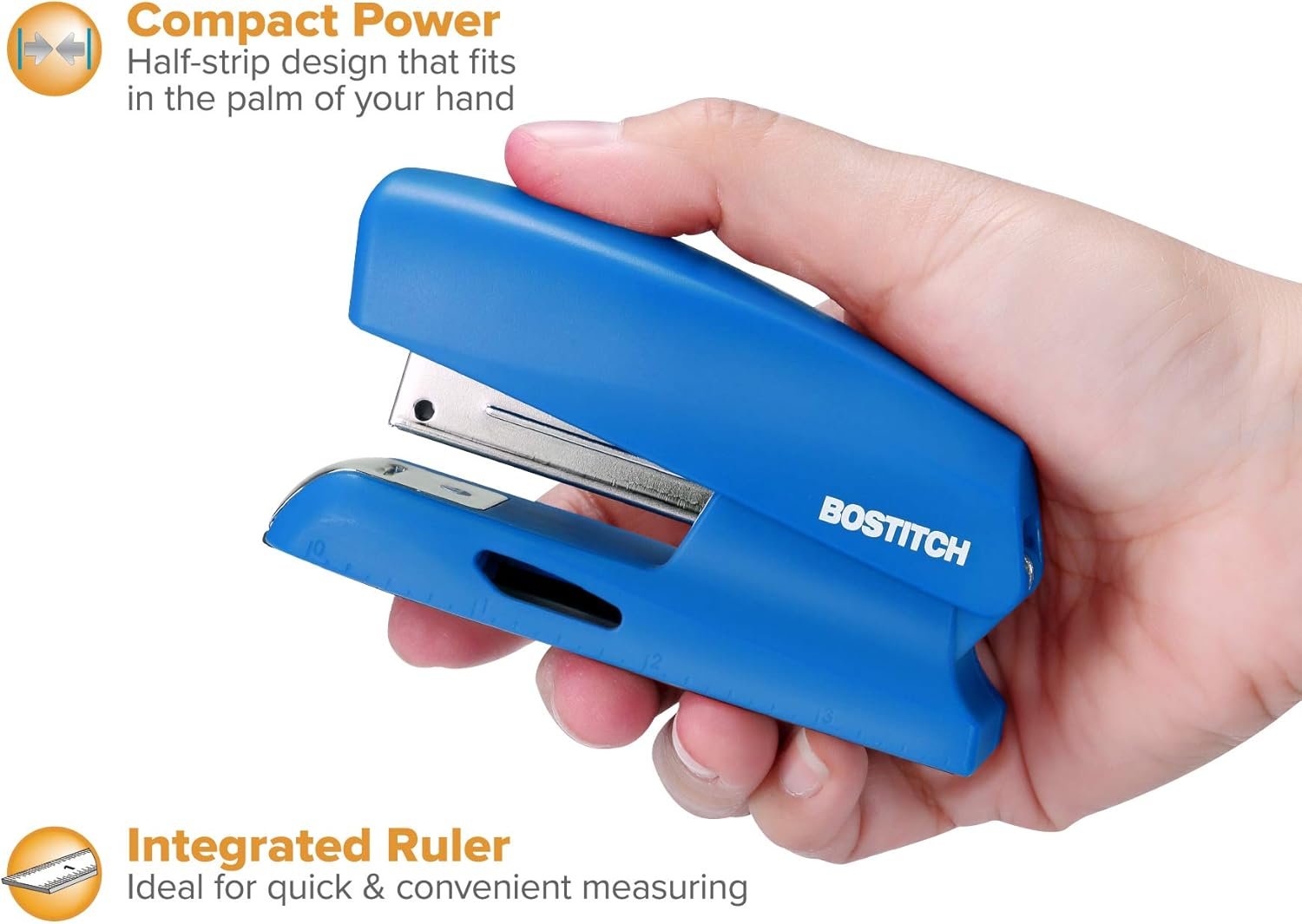 Experience quality stapling with this compact stapler. It staples up to 20 sheets at once with it’s easy-to-handle compact design. Using standard staples, this half-strip stapler comes with 210 staples. It features an integrated StapleStore compartment on the base to keep extra sticks close by. Need to measure something? There’s even ruler on the bottom edge for simple measuring. Stands both vertically and horizontally for easy use and storage. Opens for bulletin board tacking and crafting! Zero movement during use thanks to the rubber base. Color matches other organization products for a clean and focused aesthetic! Features: Staples up to 20 sheetsIntegrated ruler + staple storage compartment on base. Opens for bulletin board tackingVertically standing. Compact, half-strip design. Includes 210 Premium Standard Staples.