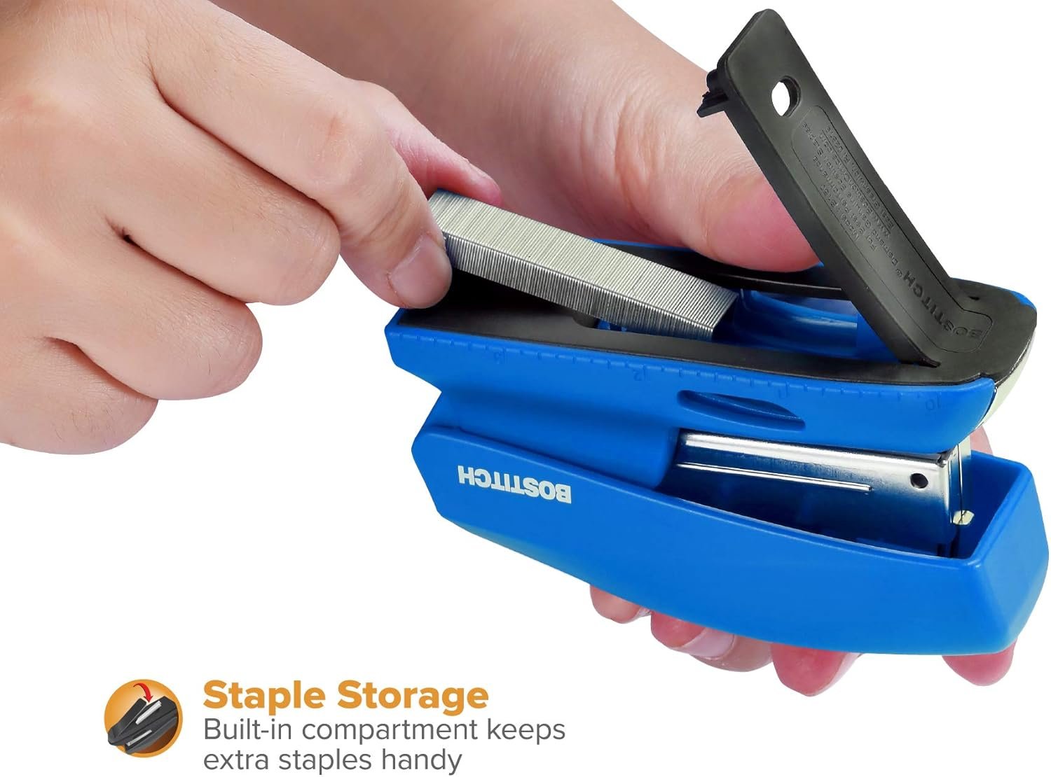 Built-in staple storage keeps extra staples handy