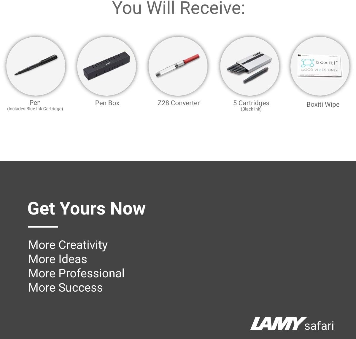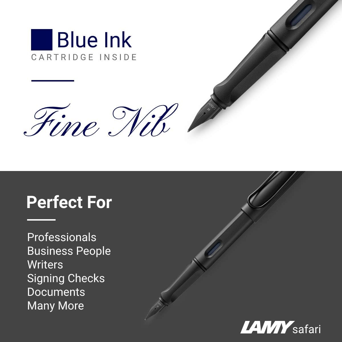 ποΈ Lamy Ink: This Safari fountain pen comes with a blue ink cartridge inside + 5 additional black ink cartridges and a Z28 converter which can be used to refill it with a bottle of ink. The Lamy Safari Pen has an ink window that shows you how much ink is left in the cartridge. This pen accepts Lamy T10 ink cartridges.