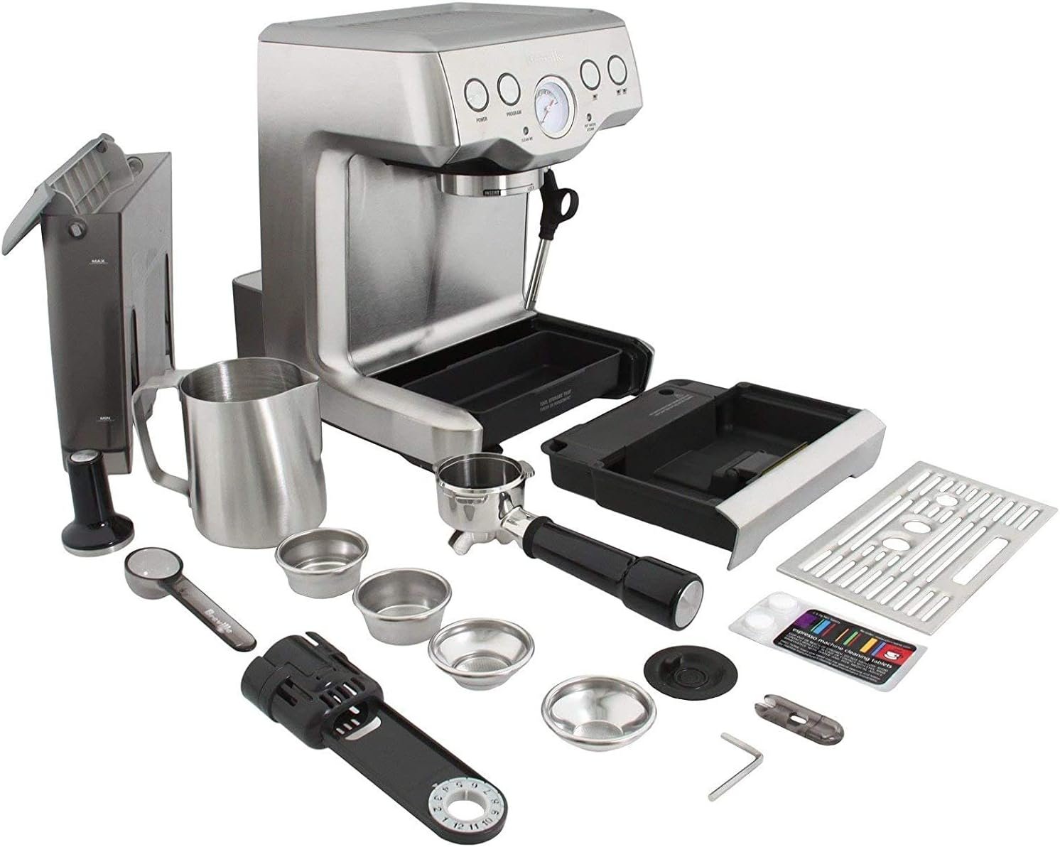 INCLUDED ACCESSORIES: Single & Dual Wall Filter Baskets, Coffee Scoop, Stainless Steel Jug, Cleaning Disc & Tablets, Cleaning Tool, and Water Filter with Holder