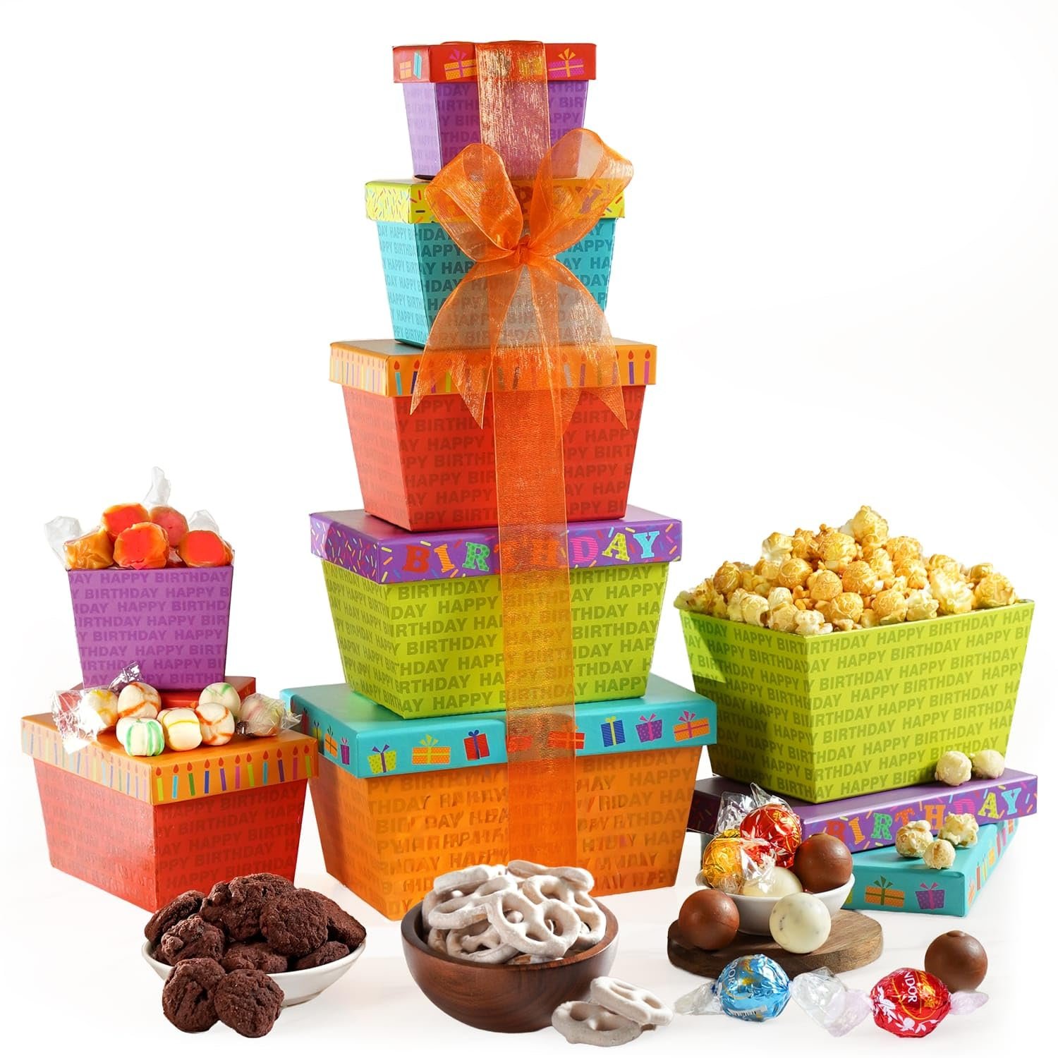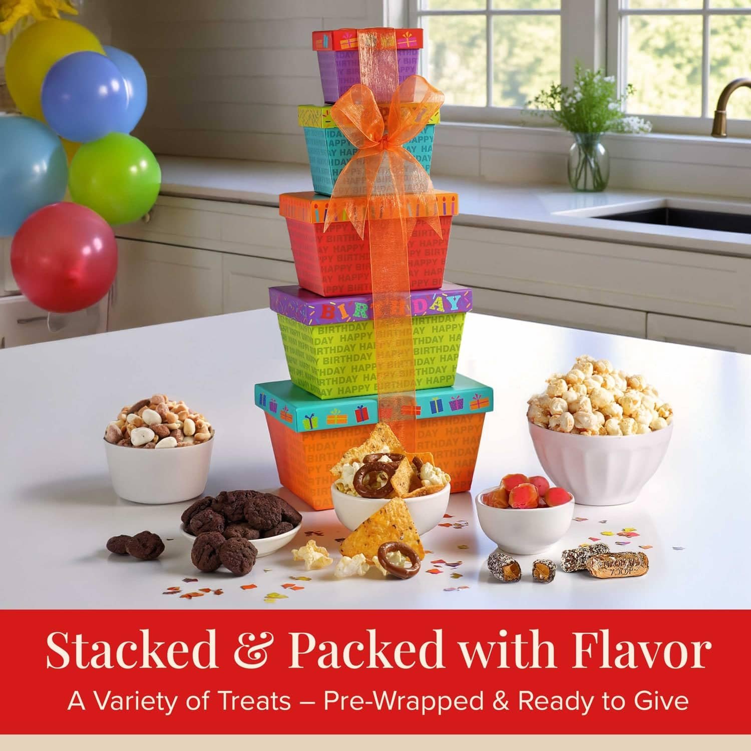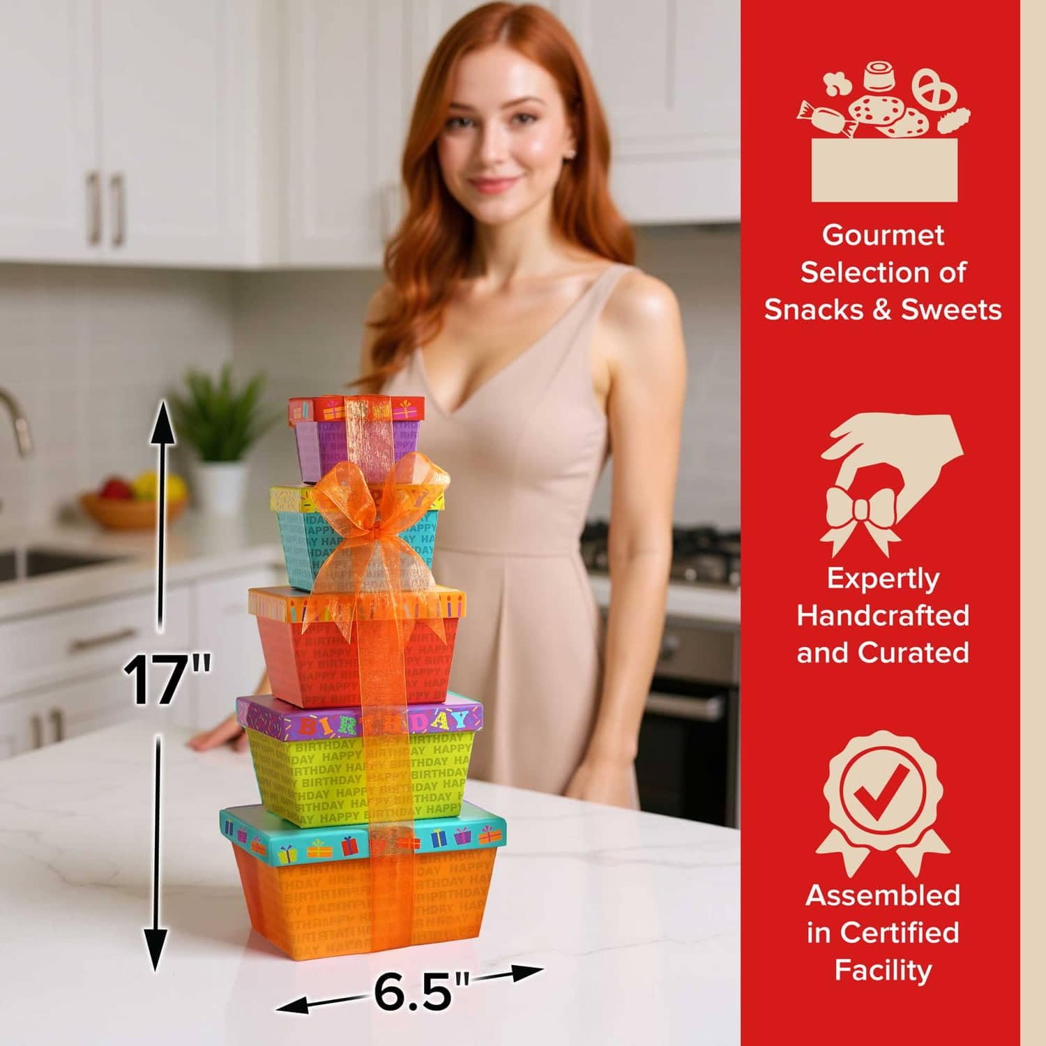 READY TO GIFT & BEAUTIFULLY PRESENTED – The tower of treats gift basket arrives as coordinated tiers tied with a bow—no extra wrapping needed. The presentation reads “birthday” the instant it lands, with layered boxes that serve neatly and store cards or keepsakes afterward. A polished look that feels special without any last-minute scrambling.