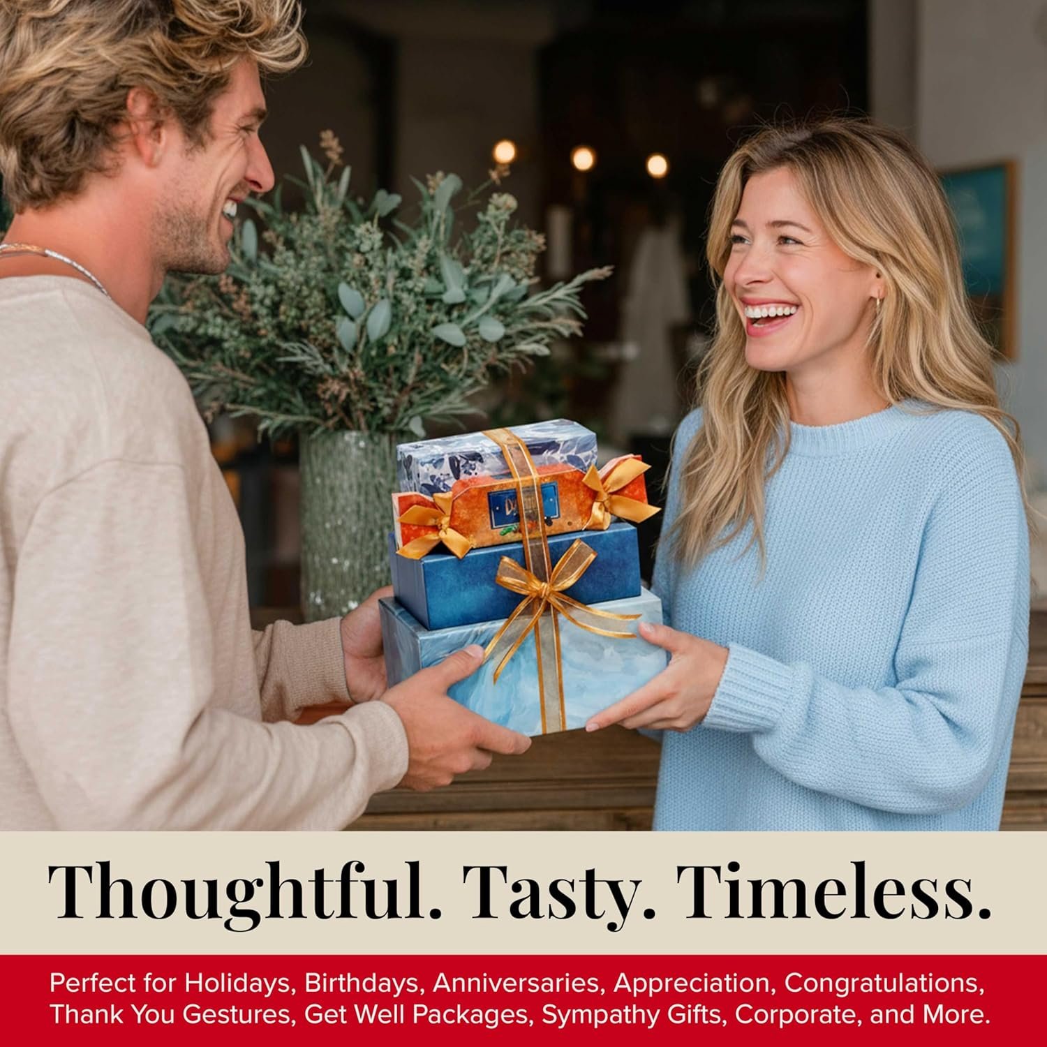 The video showcases the product in use.The video guides you through product setup.The video compares multiple products.The video shows the product being unpacked. gift basket for holiday, birthday sympathy Merchant Video