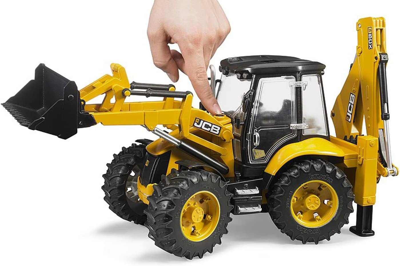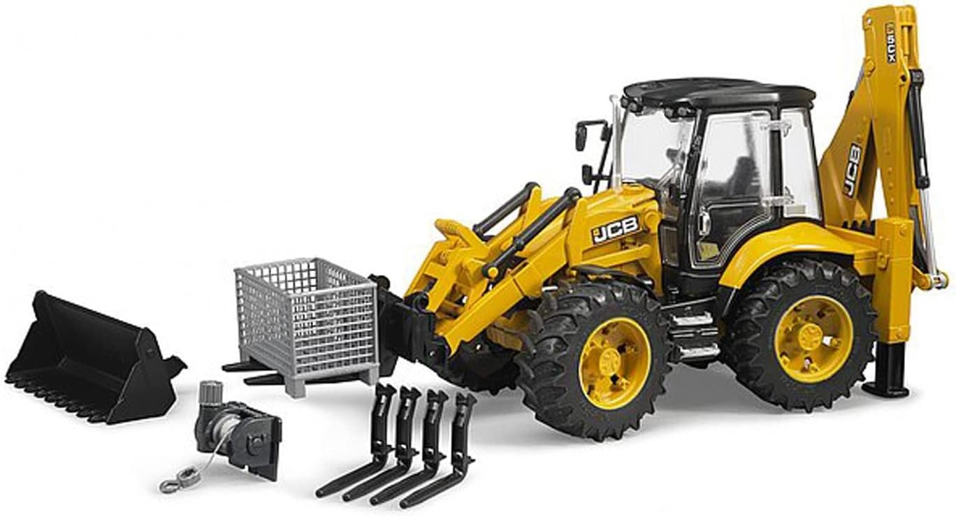 Bruder’s jcb Eco backhoe loader fully-functional backhoe and rear Digger. The front bucket tilts, locks, and is removable allowing for different options. The rear bucket excavator has two outriggers to stabilize the vehicle and enable any excavating task. Front loader arm is linked to a one handed operating mechanism and a positioned trigger button. The driver’s seat swivels and has a rear window opening. The four wheel steering ensures a tight turning circle with the addition of tread tires that can traction on almost any surface. Once the job is done, simply store the additional drag Link in the body of the vehicle.