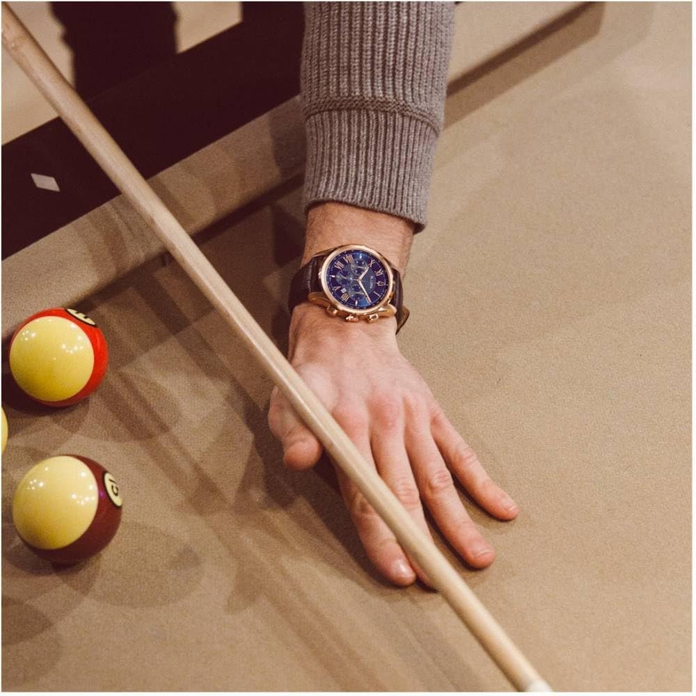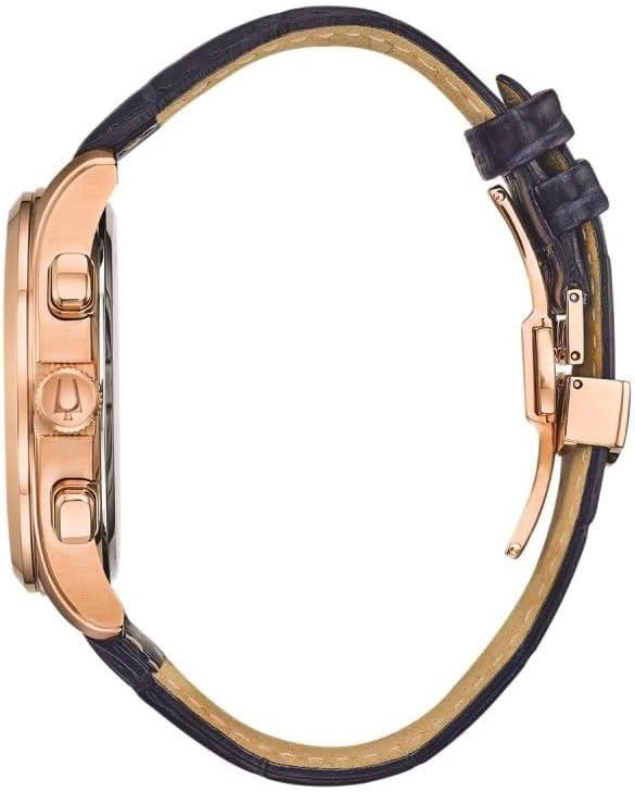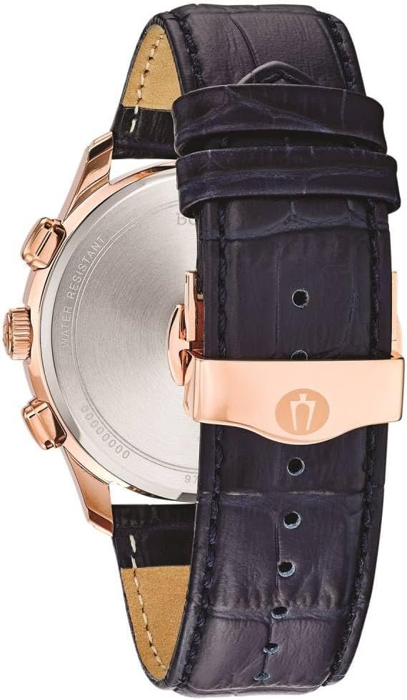 From the Classic Collection. New Wilton style with six-hand chronograph function. Rose gold-tone stainless steel case with applied Roman markers, tachymeter and calendar feature on dark blue textured dial, domed mineral glass, embossed blue leather strap with double-press deployment closure, and water resistance to 30 meters.