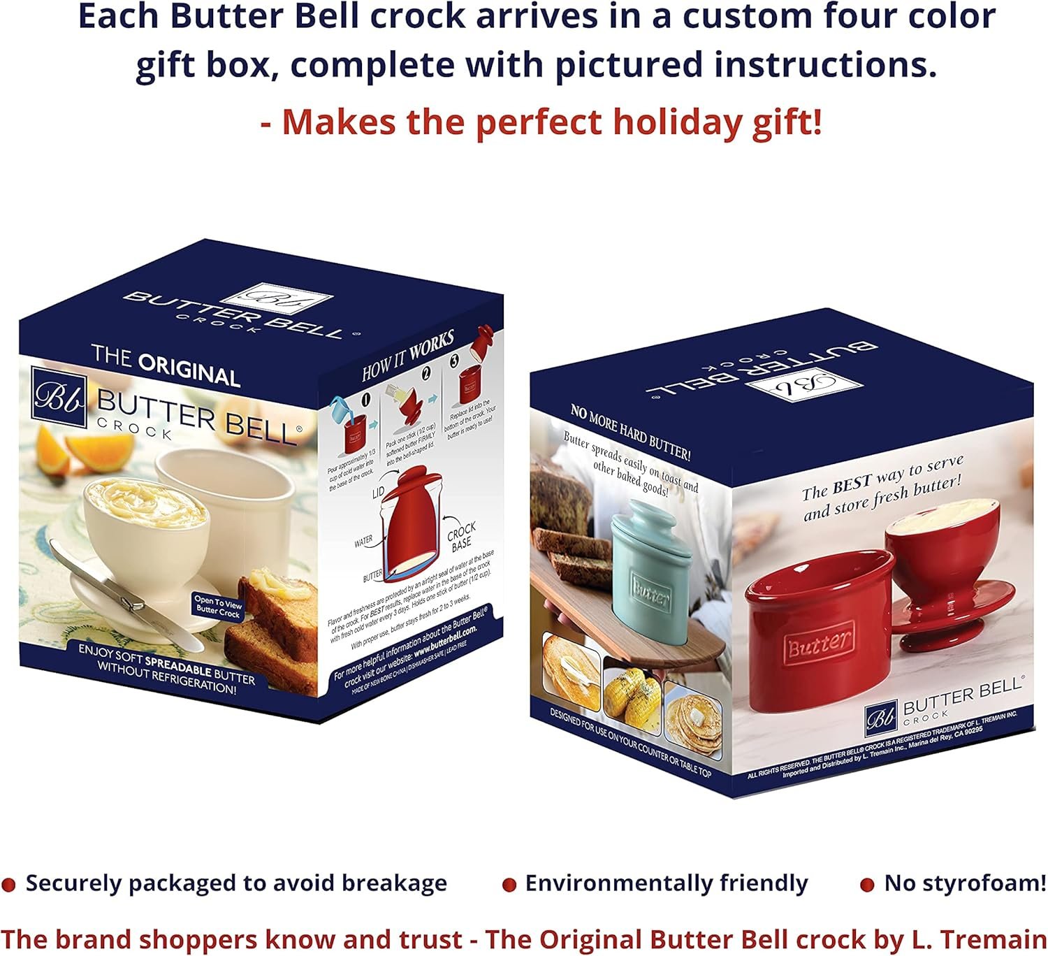 Eco-conscious packaging – perfect for gifting – Each original Butter Bell crock arrives in specially designed, recyclable four-color gift packaging – ideal for housewarming gifts, wedding registries, holidays, and special occasions.