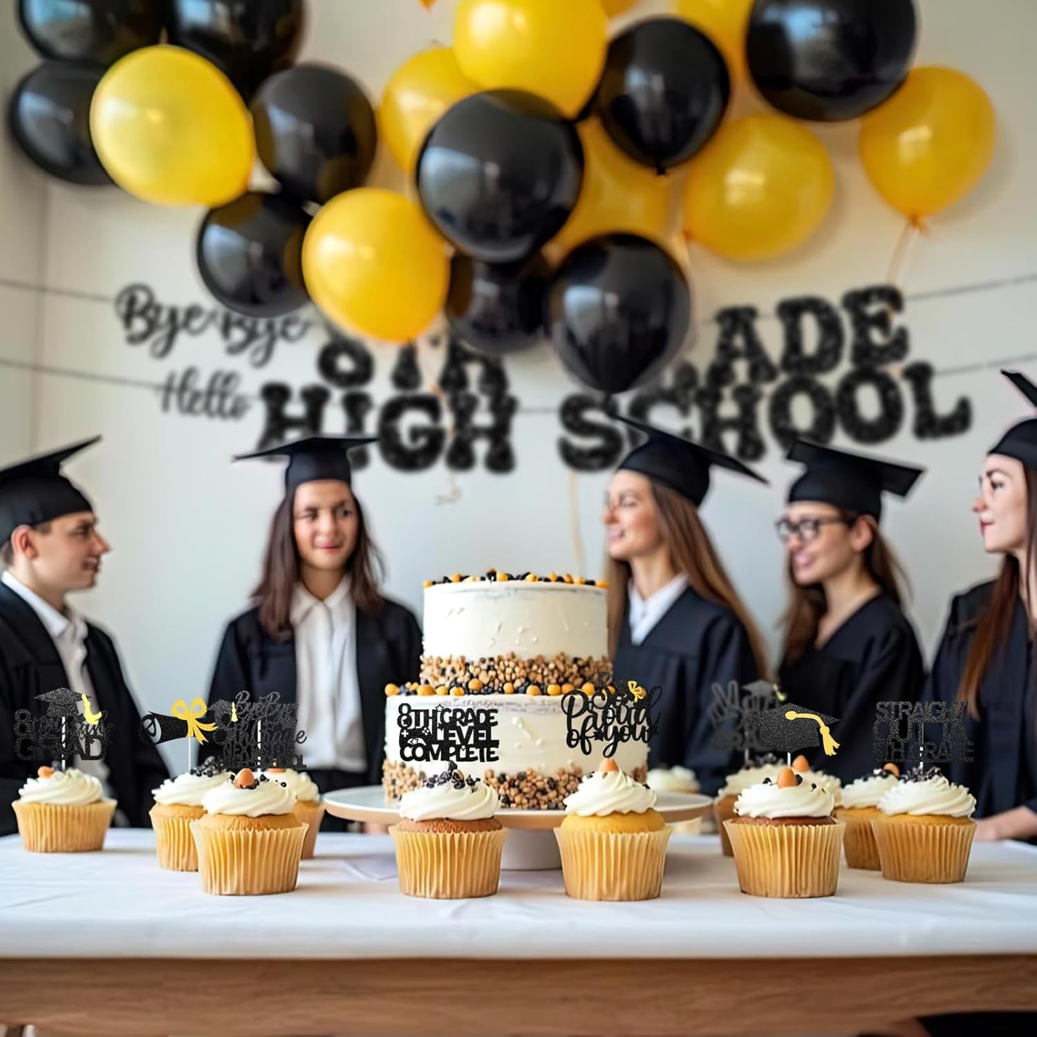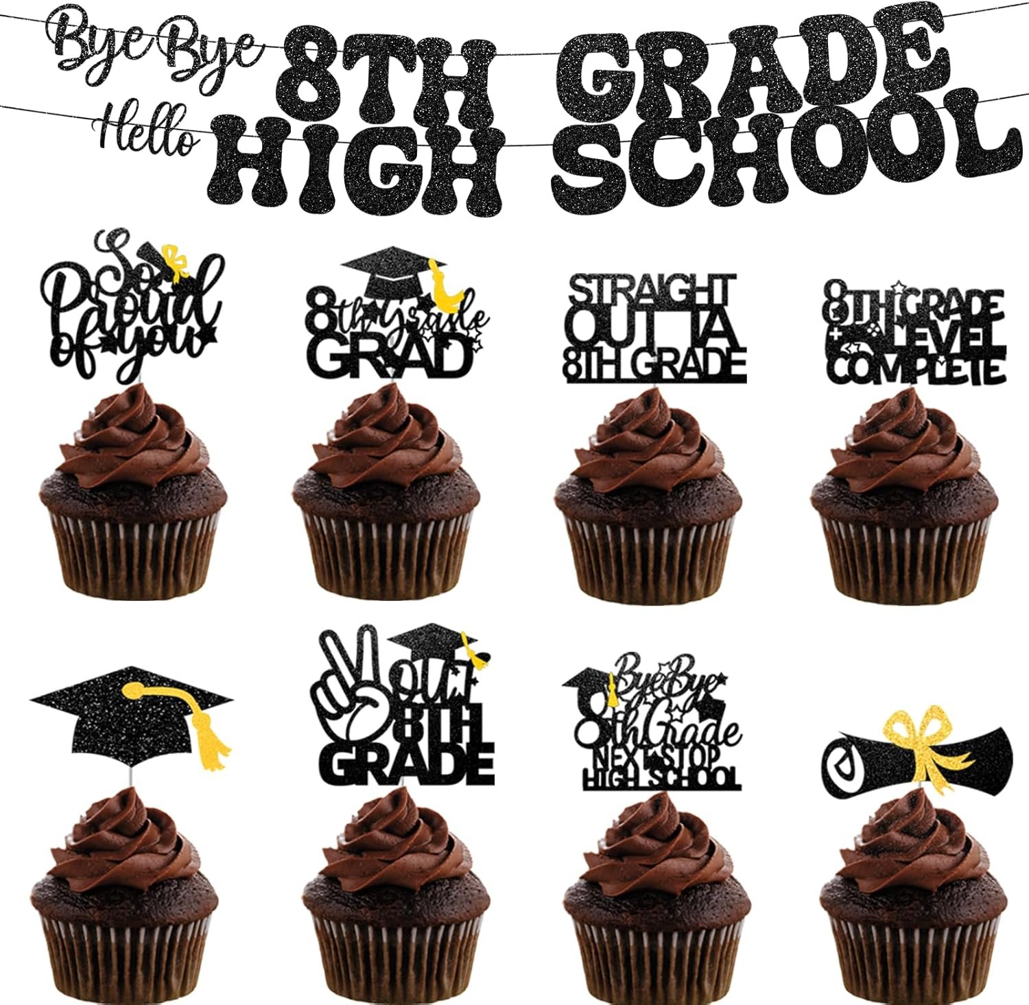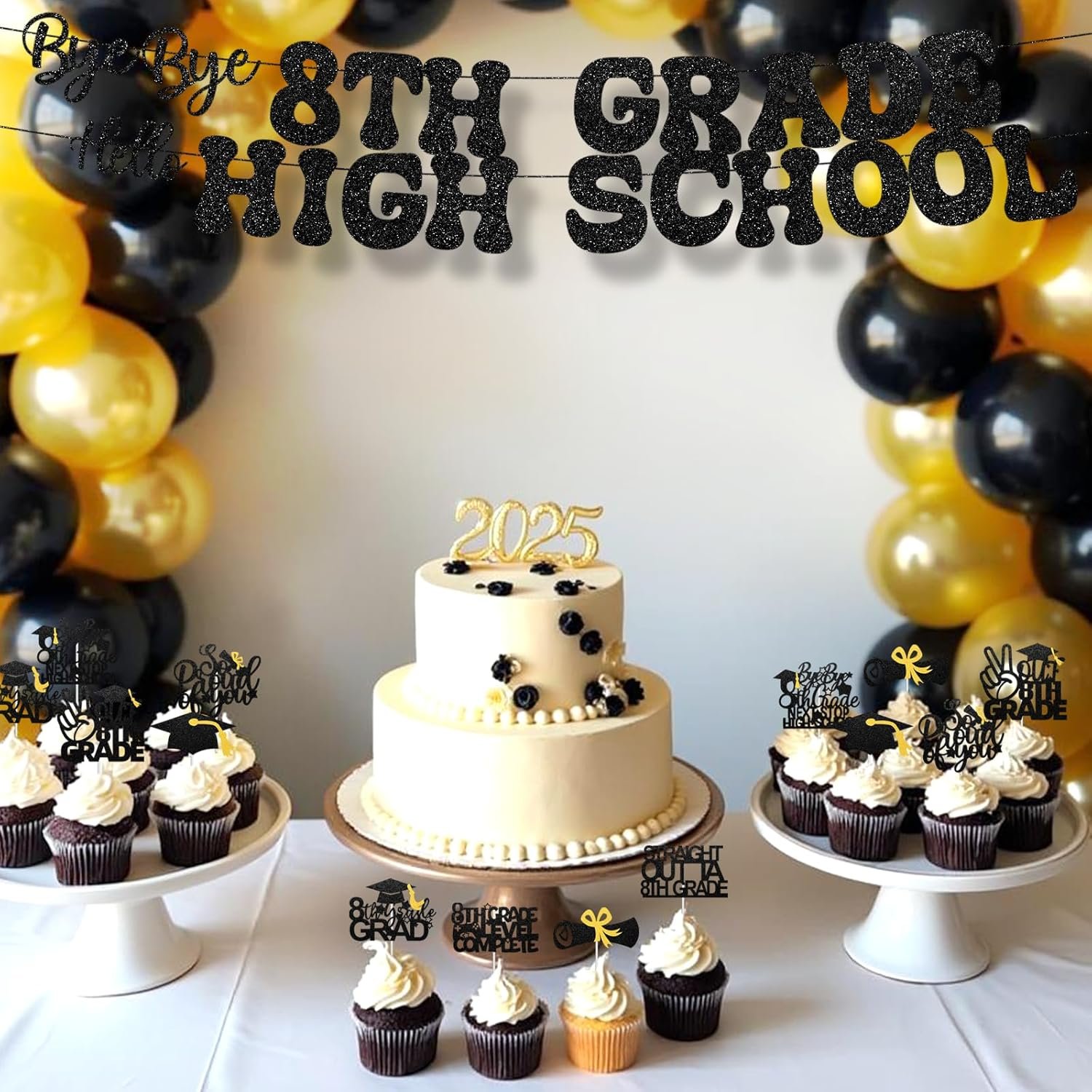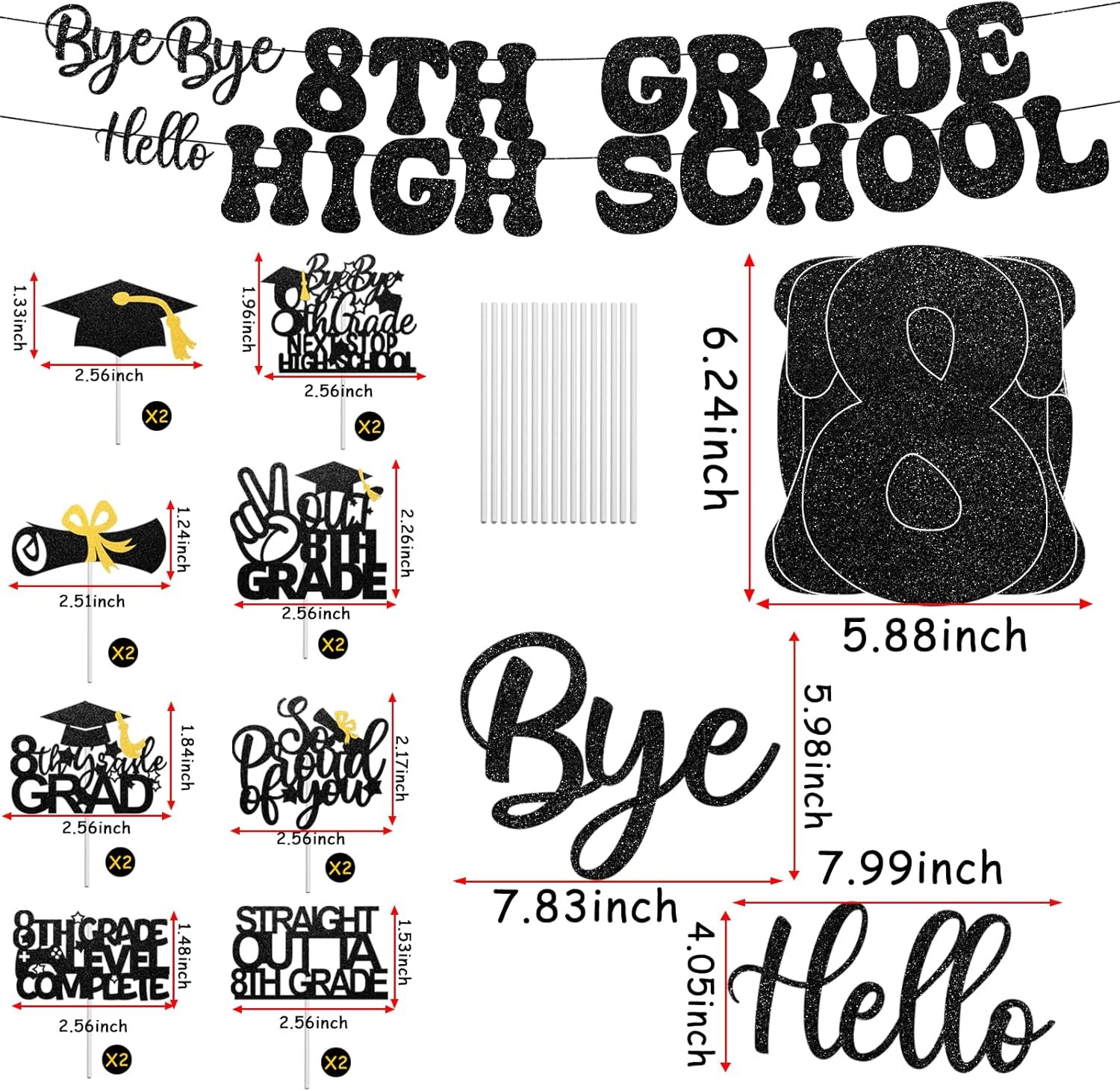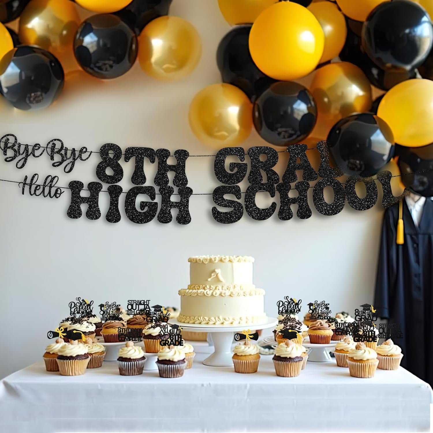 Pre-Assembled Bye Bye 8th Grade Hello High School Banner and Pre-glued 8th Grade Cupcake Toppers,you just need to open your package and choose a perfect place to Decoration