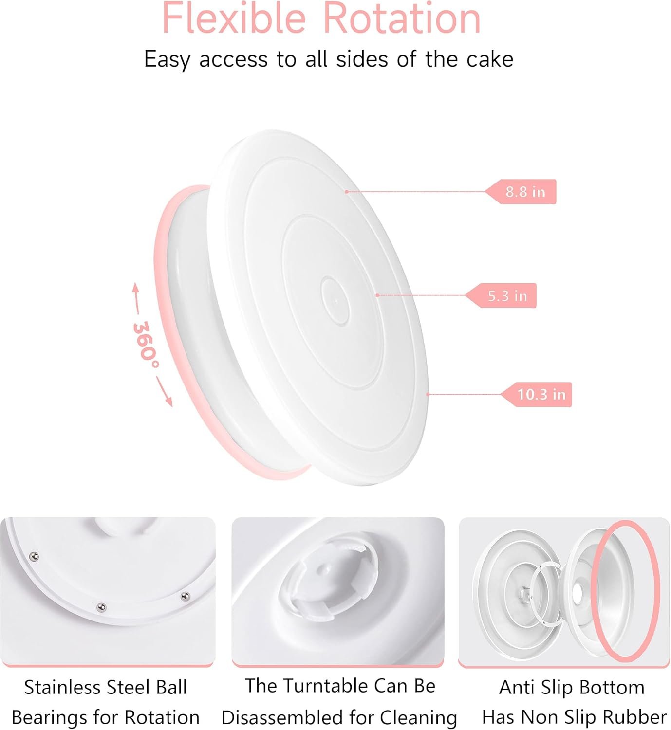 REVOLVING CAKE TURNTABLE :This cake turntable stand revolve smoothly with hidden ball bearings and helps you easily decorate cakes for birthdays, weddings and other events. It revolves clock & anti clock wise, good for both Right & Left handers. Use straight spatula for icing round cakes from sides and angled spatula from Top while rotating turntable. Turntable is made from non-stick & dishwasher safe plastic