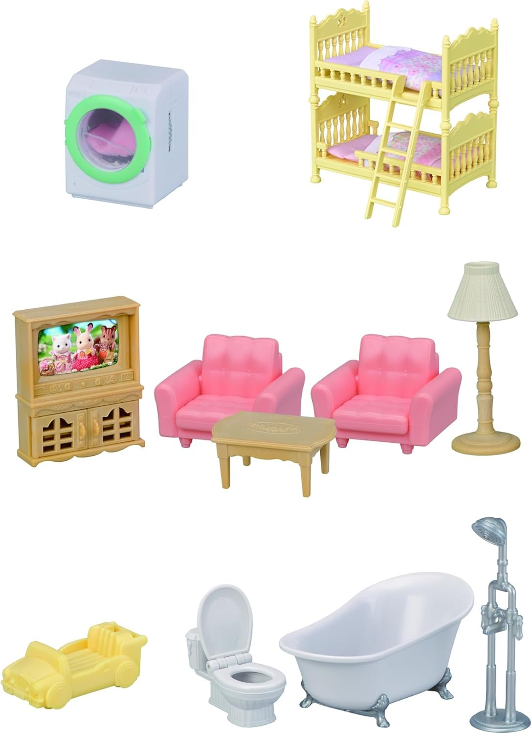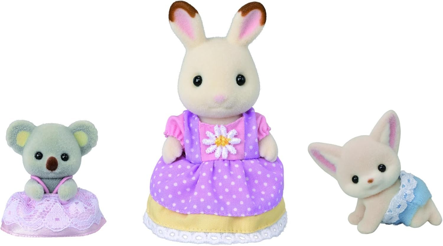 Create your own stories with three posable figures including Husky Mother Avril, Husky Baby Linnea and Chocolate Rabbit baby Crème! Set includes living room and bathroom furniture to fill the rooms of the Country Home!