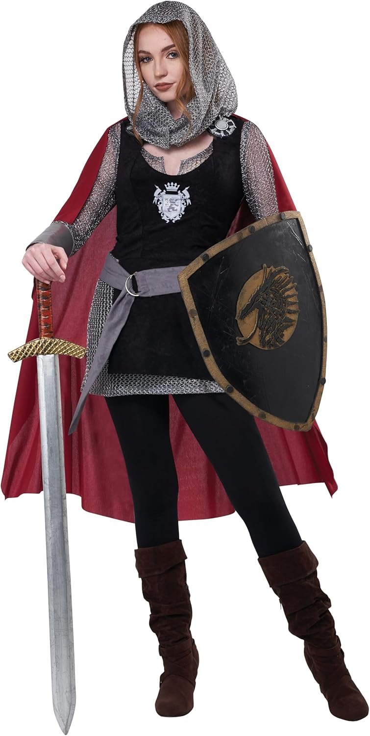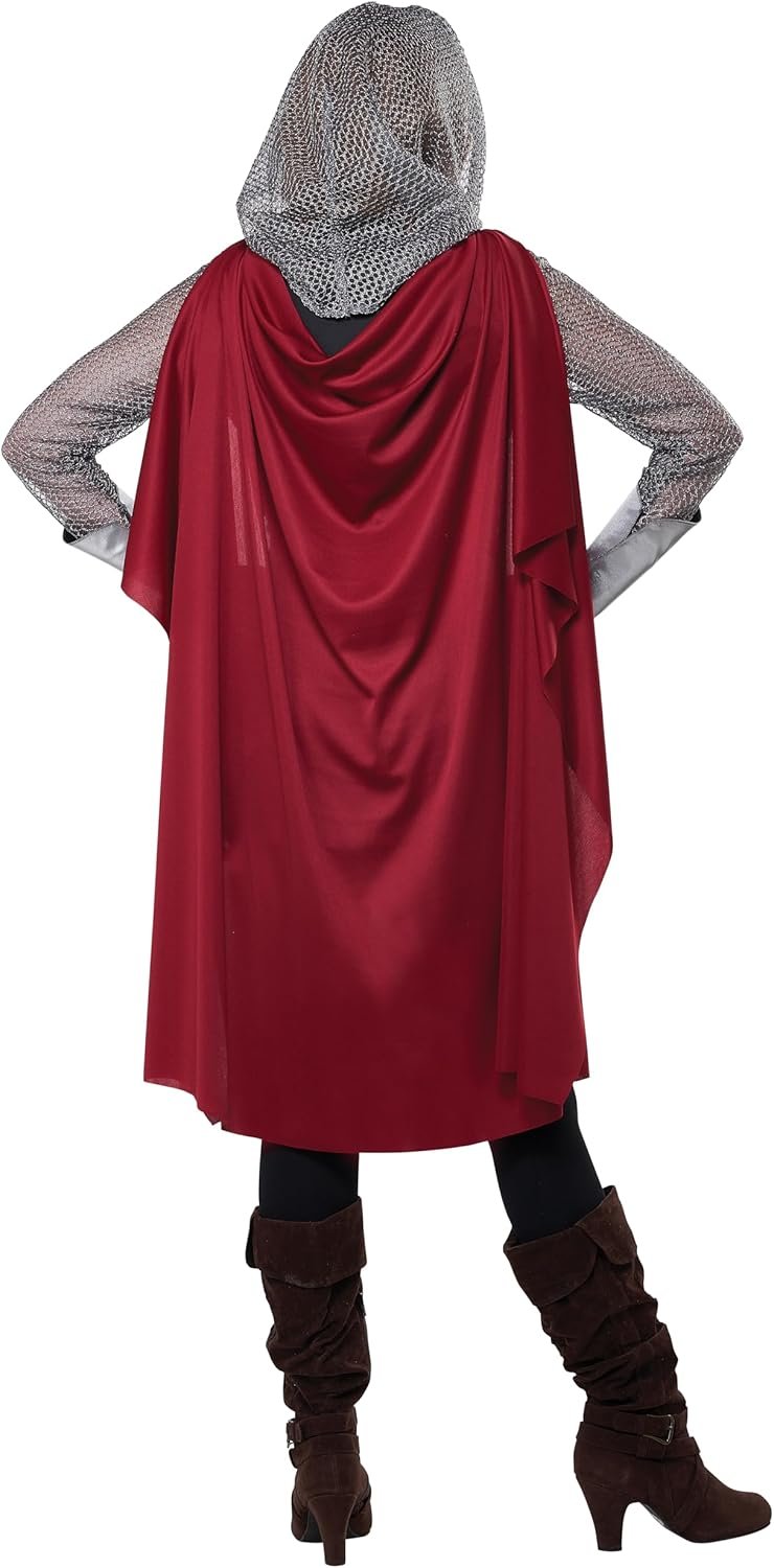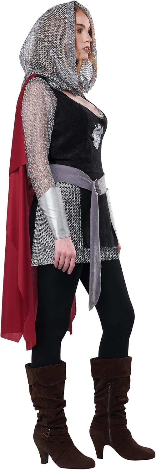 Ladies Knight takes on a fierce look with a chain mail tunic and hood covered up by a short black dress. Accessories are Cuffs, Cape, Belt, and Medallions.