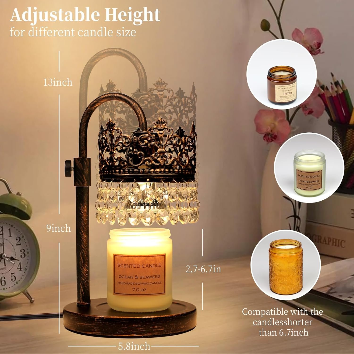 Challoween candle warmer lamp black candle warmer lamp wax melt lamp gothic candle warmer yeuslor gold candle warmer lamp halogen lamp crystal candle warmer GU10 bulb lamp Crown moonshade candle lamp vintage candle warmer Valentine’s Day gifts for him andle warmer lamp adjustable height with a knob-style lifting structure ,Turn the knob clockwise,Compatible with the candles shorter than 6.7inch,this lamp allows you to adjust the height to control wax pool temperature and melting speed. Say goodbye to uneven burning and wasted wax—enjoy consistent fragrance release
