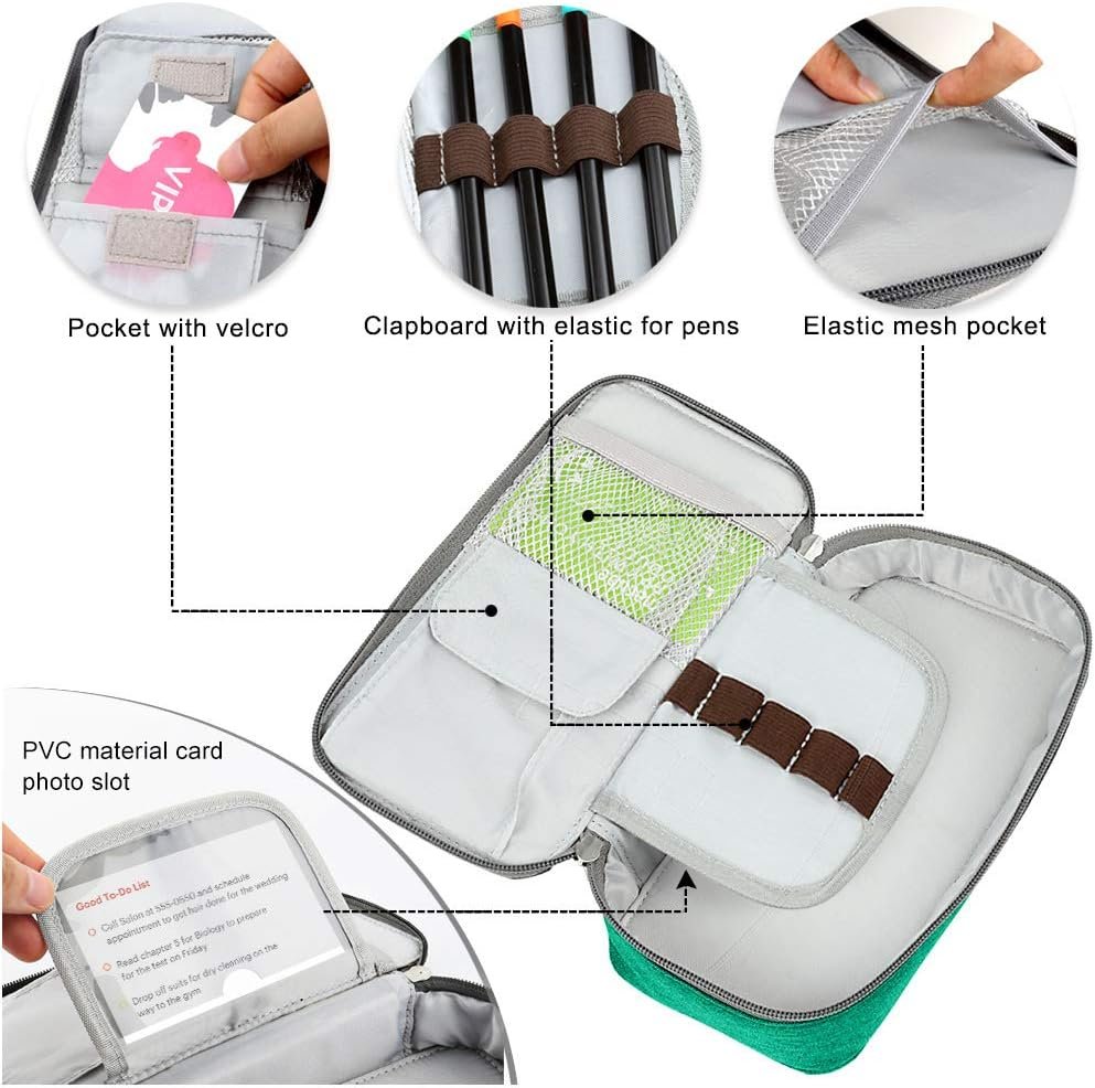【PRAGMATIC CONSTRUCTION】: The inner velcro closed pocket can hold your cards, sticky notes or changes, The mesh pocket can keep your usb cable or ear buds well in place, The center hard flap with pen loops can hold 6 pieces frequently used pens for a quick access, The back of the flap with a transparent card/photo slot.