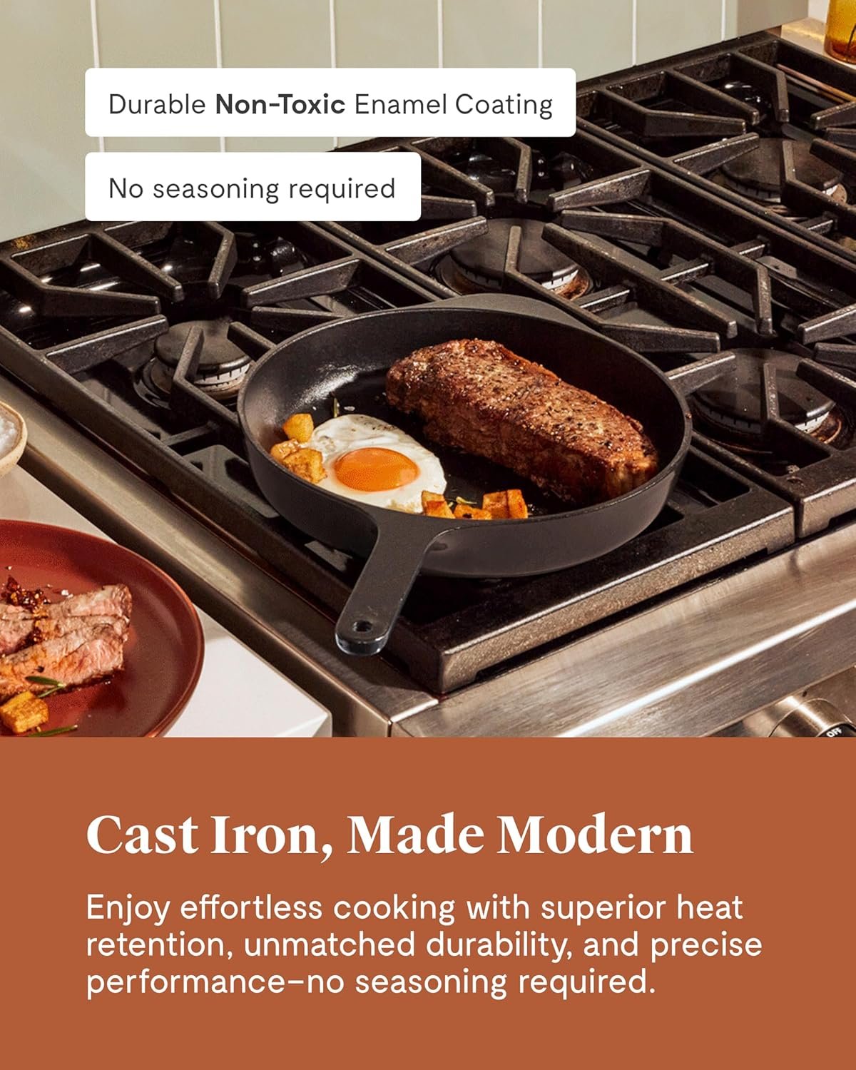 DURABLE ENAMELED CAST IRON: The 10.5″ cast iron pan features a scratch-resistant 3-layer enamel coating for excellent heat retention and easy care, no seasoning required for this cast iron cookware essential.