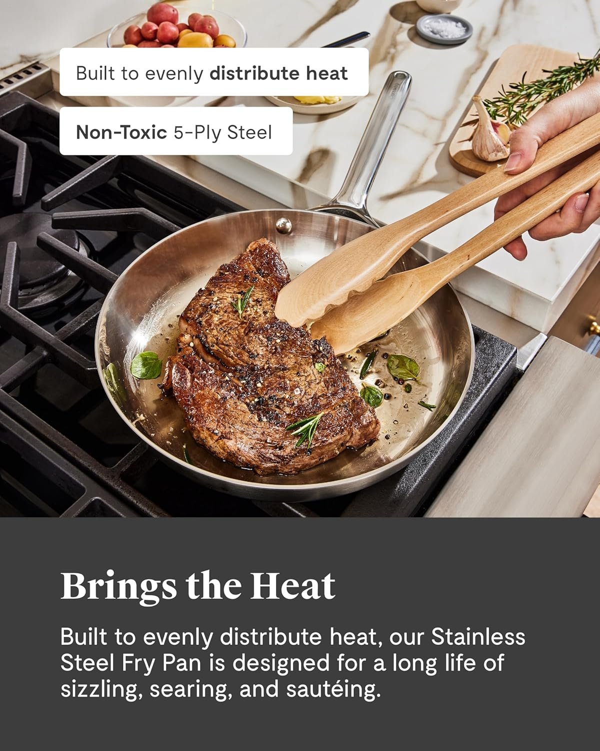 5-PLY STAINLESS STEEL CONSTRUCTION: The stainless steel pan is built with 5 durable layers for even heat distribution and superior searing, sautéing, and frying. Ideal for high-heat cooking and clean design lovers.