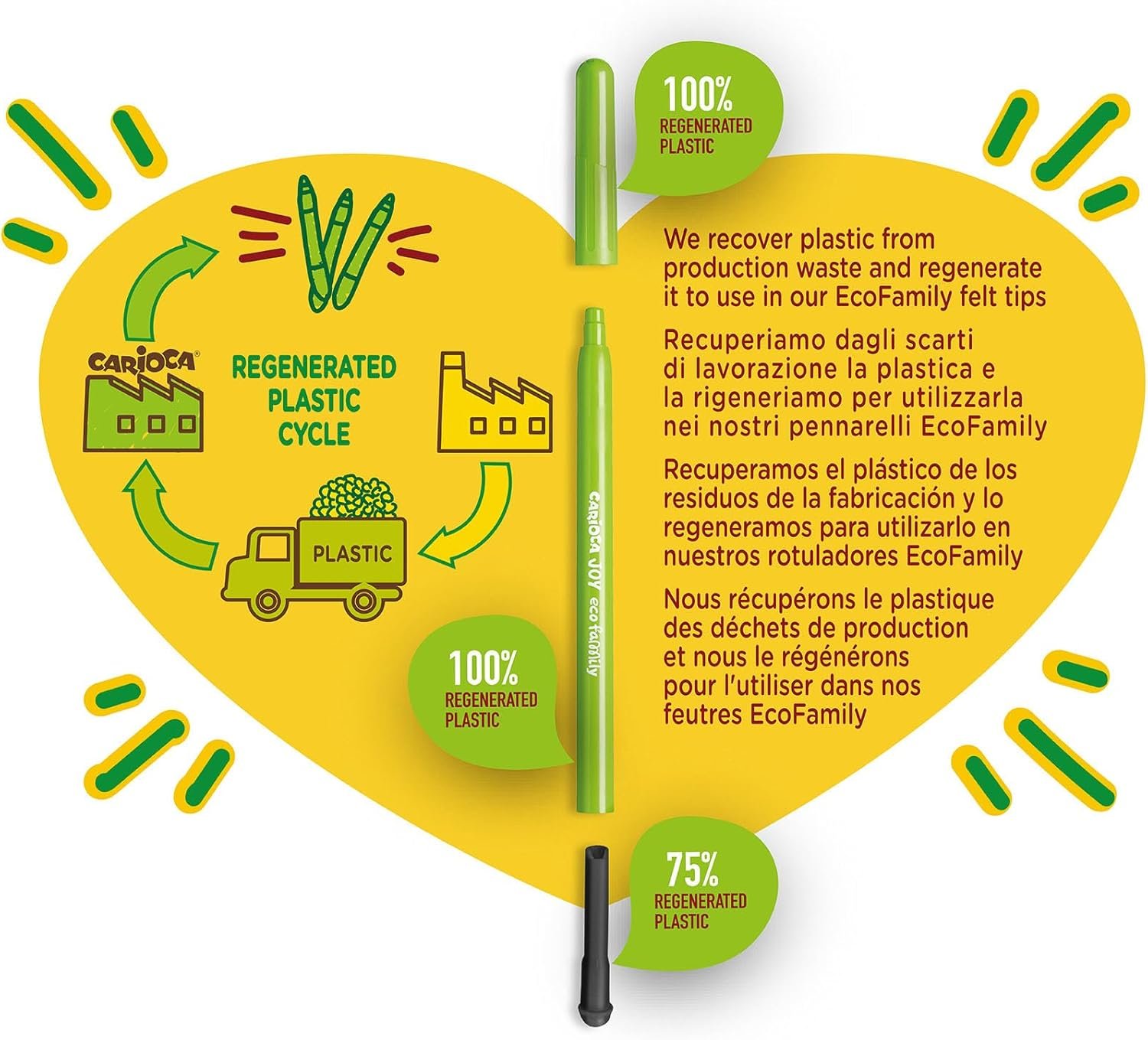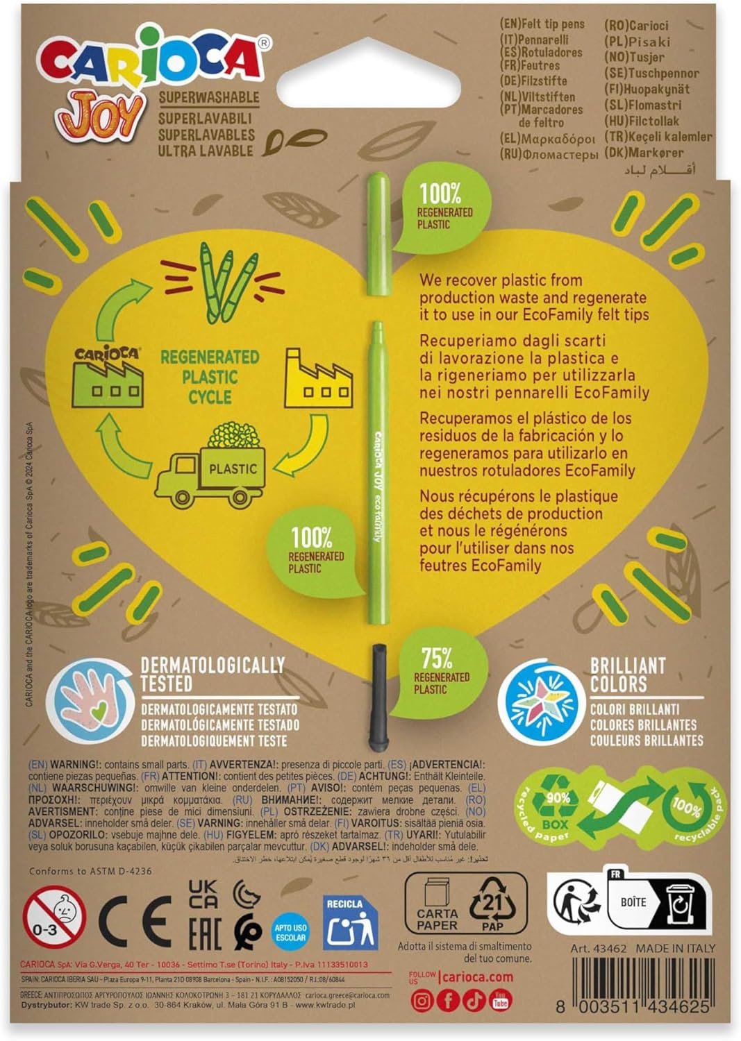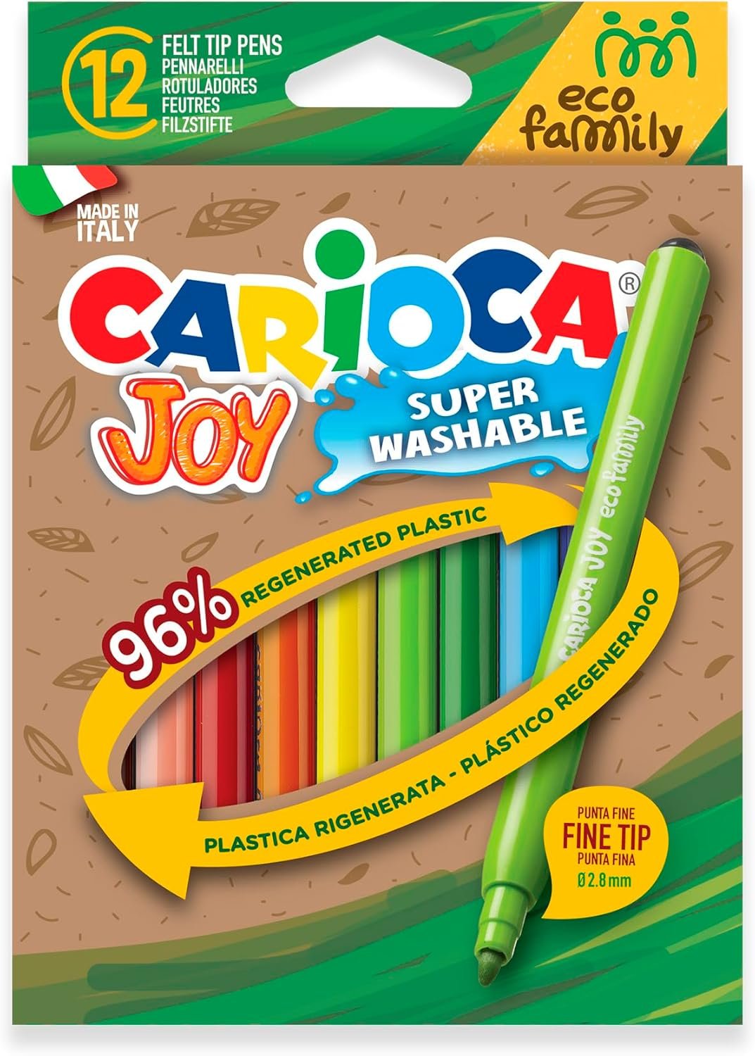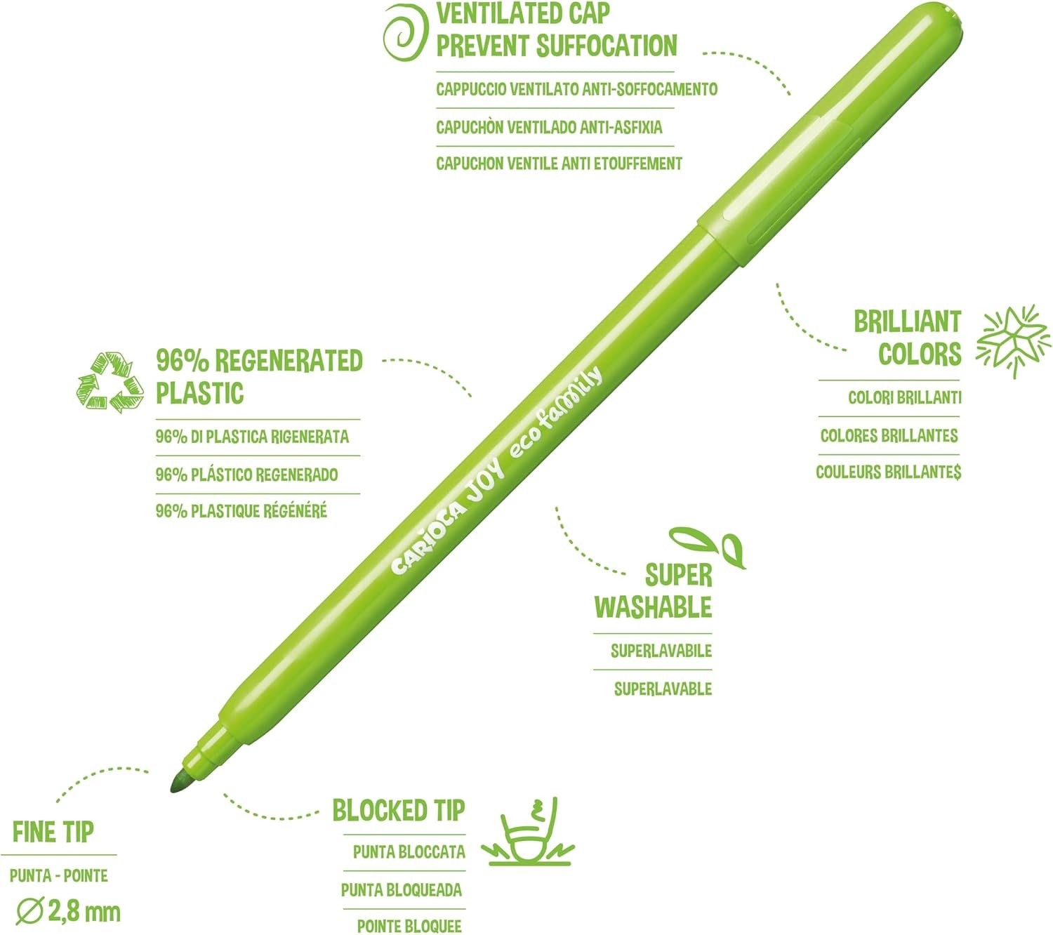 Help your child express creativity while caring for the planet with Carioca ECO FAMILY Joy Fine Tip Markers – 12-Pack. Made from 96% regenerated plastic, these sustainable felt tip pens combine precision, safety, and vibrant color for kids’ daily drawing and learning activities. Each marker features a 2.8 mm fine blocked tip that’s perfect for detailed coloring, outlines, or writing. The super washable, non-toxic ink ensures safe and stress-free use at school or at home – simply wash it off skin and fabrics with water. These child-friendly markers also include ventilated anti-choking caps and are Made in Italy to the highest safety and quality standards. Add them to your child’s school supplies or use them for eco-conscious family crafts.
