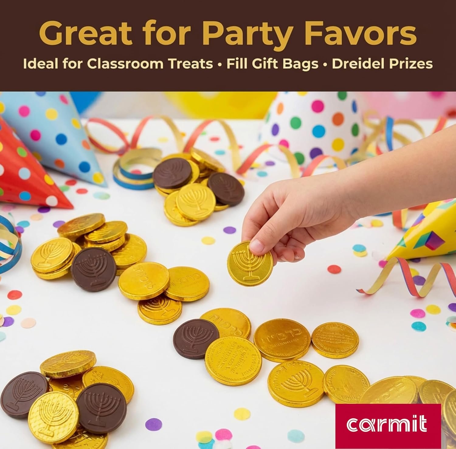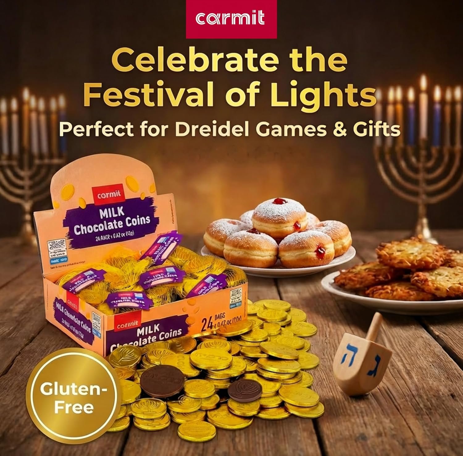 Bring home the fun and tradition with Carmit Kosher Milk Chocolate Gold Coins! This 24 pack of rich, creamy milk chocolate coins, each individually wrapped in dazzling gold foil that truly looks like treasure. As the authentic Hanukkah gelt for the season, they are perfect for dreidel games and family gatherings, but their classic look also makes them fantastic party favors, treasure hunt prizes, and stocking stuffers year-round. Crafted by the trusted Carmit brand and certified Kosher Dairy, these delicious gold coins are a must-have holiday candy that delights both children and adults.
