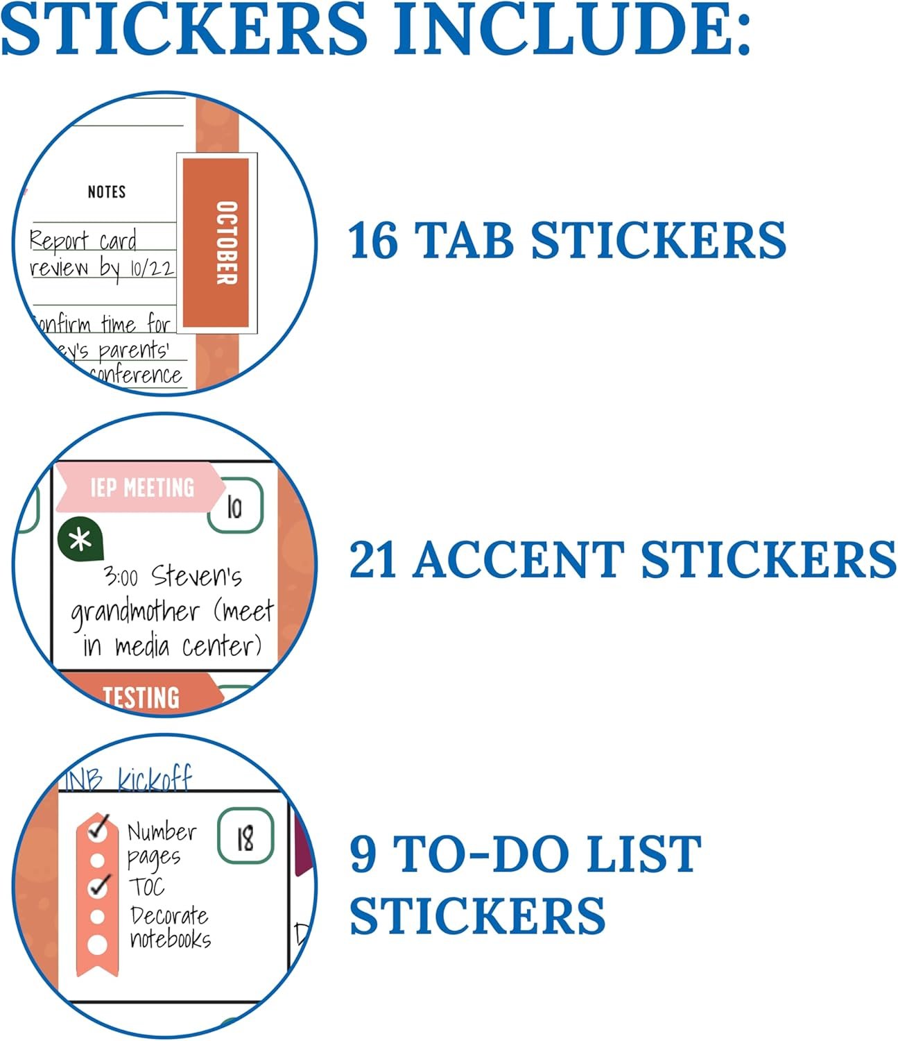 Teacher Planner Features: This teacher plan book includes 116 planner stickers, including 16 tab, 9 to-do list, 64 reminder, 6 note, and 21 accent stickers to organize your spiral planner and keep track of progress with ease.